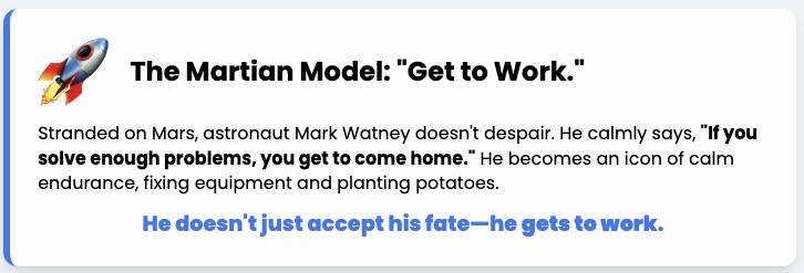 On the red planet, the air is poisonous, thereโs no food and no-one to help. Youโd expect this man to panic and despair, and yet he doesnโt. With a cool head he says, โIf you solve enough problems, you get to come home.โ