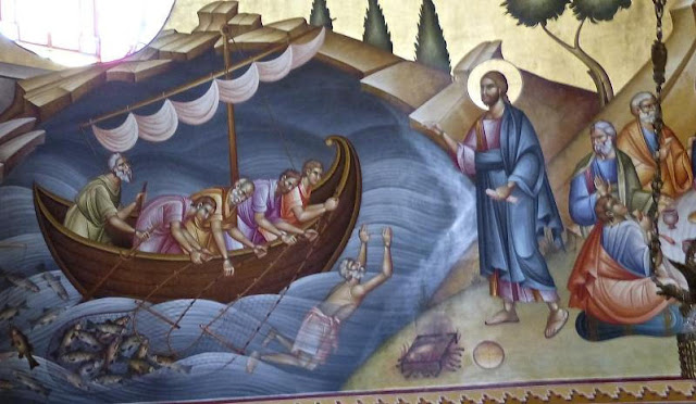 Scripture Scholar Fr. Raymond Brown suggested that, although the two stories in today’s Gospel reading seem to follow one after the other haphazardly, they are, nevertheless, related and held together by the common theme of discipleship. There is Peter in the boat out in the water. The boat reminds us of the Church, Peter’s boat, sailing over the waters of time. Jesus is at the shore, calling to mind the end of time, our heavenly destination. Jesus, looking from heaven, sees the Church not being very successful in its evangelization, not catching many fish. Notice that it is dark when this happens. The darkness calls to mind the sinfulness of its evangelizers.
