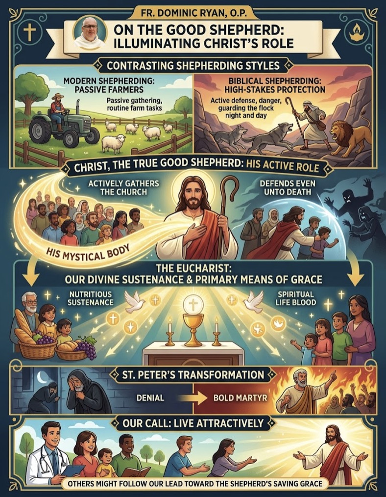 - Exegesis: The preacher expertly uses the Good Shepherd metaphor not just as a comforting image, but as a framework for the prophetic duty of the priesthood (to lead and feed with truth) and the duty of the laity (to listen and discern).