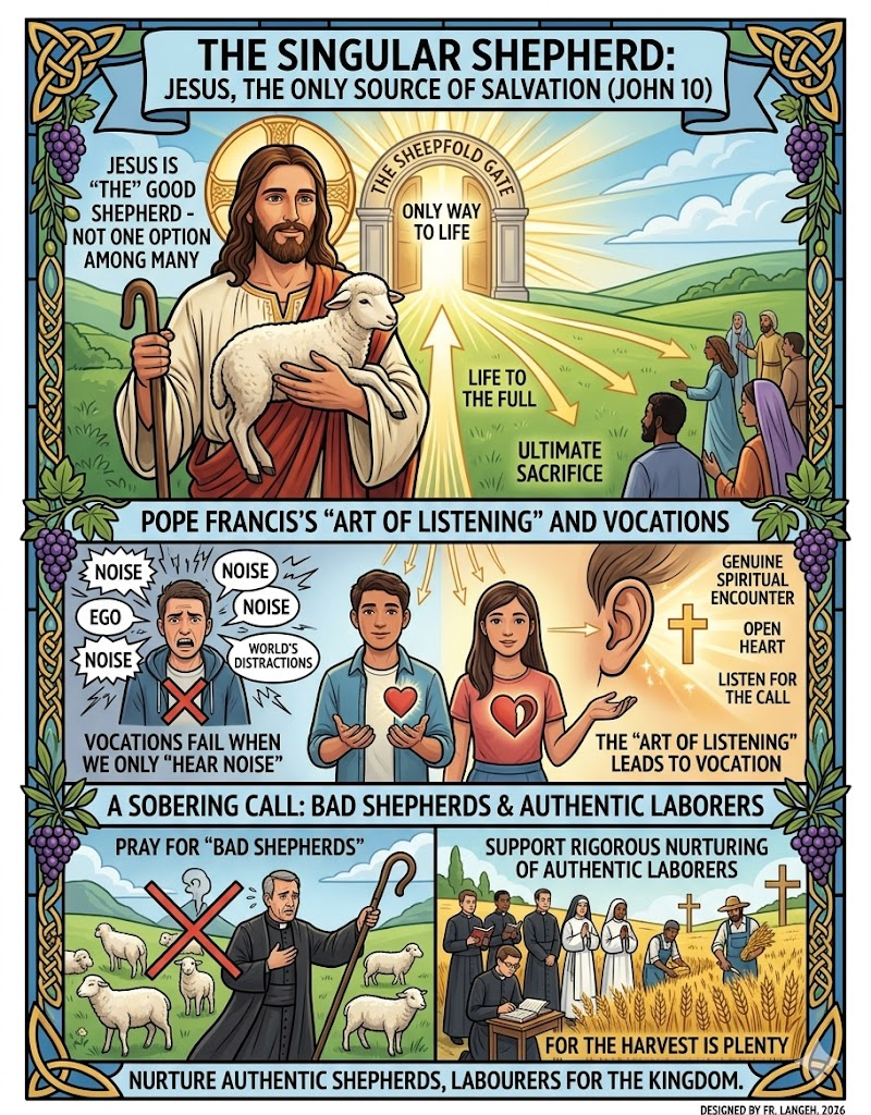 Fr. Jude Langeh emphasizes the distinction between Jesus as “The” Good Shepherd—the singular source of salvation—rather than just one of many options. Drawing on John 10, he presents Christ as both the Shepherd and the Sheepfold Gate, whose ultimate sacrifice provides “life to the full.” Fr. Langeh incorporates Pope Francis’s teaching on the “art of listening” to argue that vocations fail when we merely hear noise rather than opening our hearts to a genuine spiritual encounter. He concludes with a sobering call to pray for “bad shepherds” and to support the rigorous nurturing of authentic laborers for the harvest.