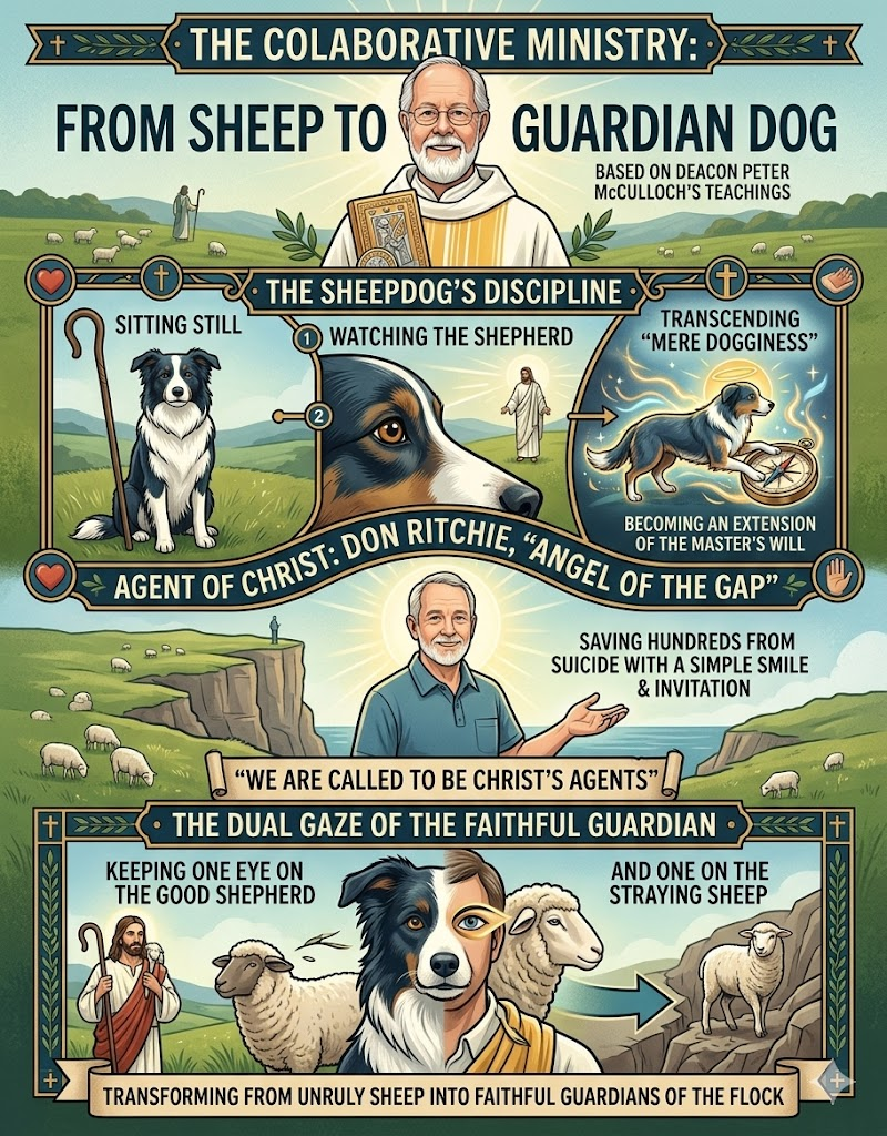 Deacon Peter McCulloch uses the imagery of sheepdog trials to explore the collaborative nature of ministry. He highlights the “sheepdog’s” discipline: sitting still, watching the shepherd, and transcending “mere dogginess” to become an extension of the master’s will. Through the story of Don Ritchie, the “Angel of the Gap,” who saved hundreds from suicide with a simple smile and an invitation, McCulloch illustrates that we are called to be Christ’s agents. By keeping one eye on the Good Shepherd and one on the straying sheep, we transform from unruly sheep into faithful guardians of the flock.