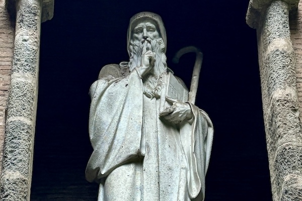 Near the entrance is a remarkable statue. It’s St. Benedict, larger than life, greeting all those arriving with a simple gesture: he is holding his finger to his lips. The universal call for quiet, for silence. Hush.