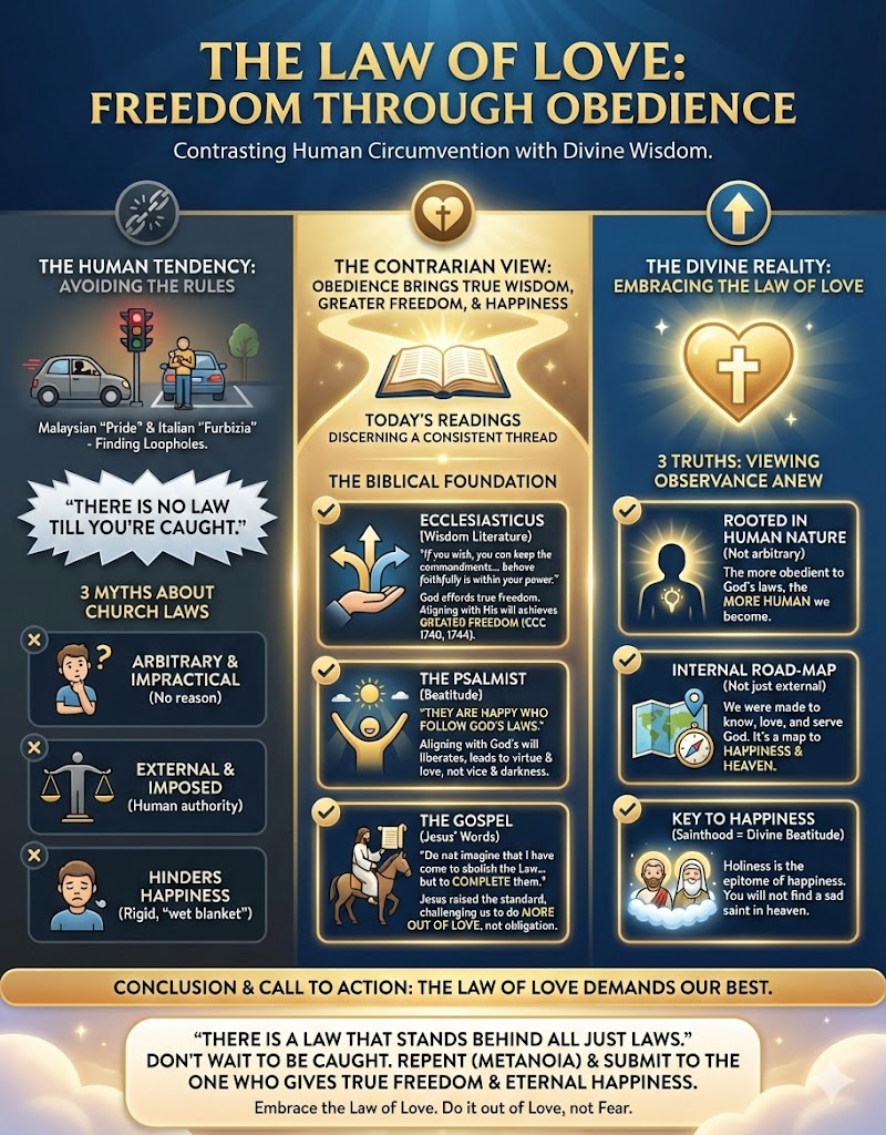 But today’s readings provide us with a contrarian view. From the first reading to the gospel, we can discern a consistent thread that reminds us that obedience to the Law brings with it true wisdom, greater freedom and happiness.