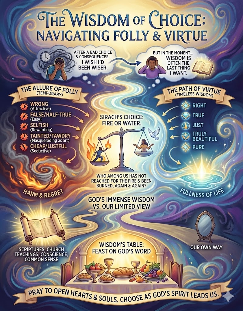Today’s First Reading from the Book of Sirach would appreciate Dr. Phil’s method. It lays out our moral choices in a blunt, no nonsense way. It says our choices are good or evil, life or death, water or fire. We can choose any one. But if we choose evil, we should not be shocked to find we are unhappy. If we put our hand into the fire, we should not be surprised that it is burnt. Sirach is telling us that God’s commands are not an arbitrary set of rules to test our obedience. God’s commands are the way to life. If we follow them, we will be happy. If we choose something else, it will harm us….