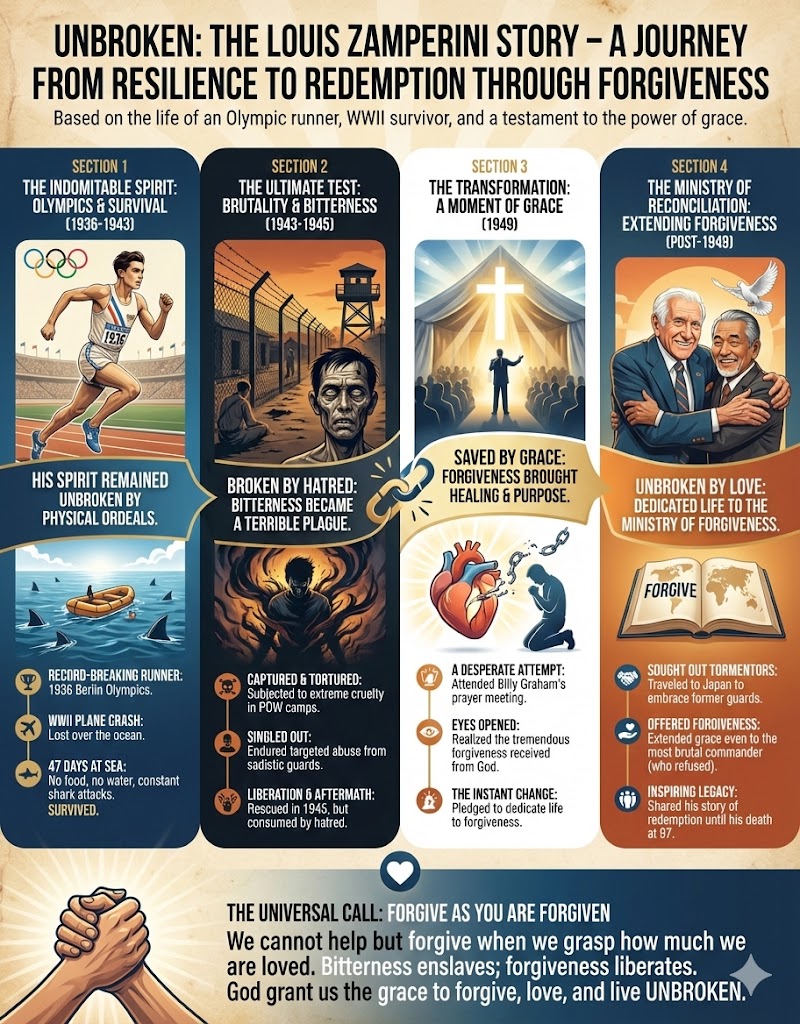 However, after the war, Zamperini faced a greater trial: he was consumed by hatred and bitterness toward his captors. This internal torment broke him in a way physical torture never could. His life changed profoundly during a prayer meeting where he realized the magnitude of God’s forgiveness for him, understanding that to save his own soul, he must also forgive.