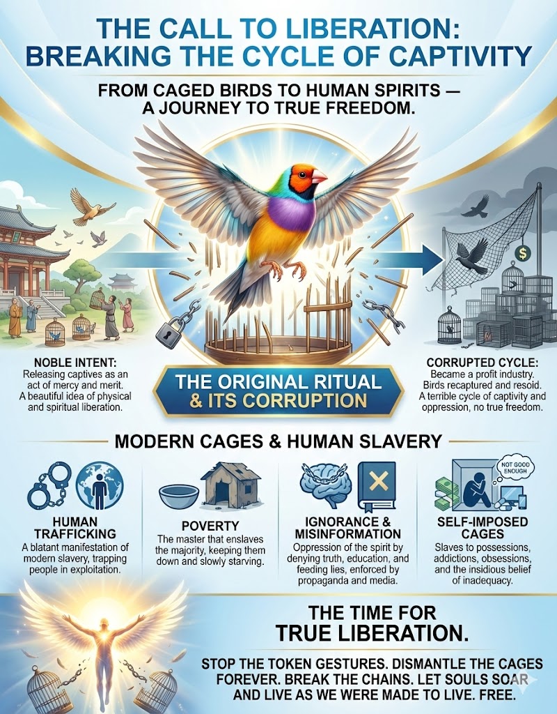 Fr. Kevin uses the example of releasing caged birds as a metaphor for liberation, initially finding the practice noble. However, he realizes it has become corrupted; the birds are trapped in a cycle of capture and release for the sake of profit and a fleeting sense of goodness. This corrupted ritual mirrors how good laws and customs, originally intended to liberate, can become oppressive over time. Jesus came to perfect the old law, offering true liberation.