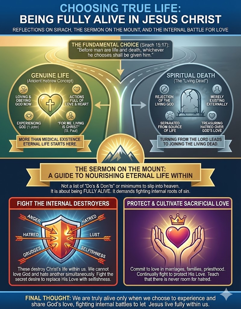 PODCAST—What a privilege we have in this week’s readings to hear from the book of Sirach, composed by an ancient sage who was deeply immersed in the Torah, the law, and the rituals of the Temple. As such, he delivers one of the deepest truths of the spiritual life: God so respects our freedom, that he will allow us to experience life or death, good or evil. He will give us what we choose and, more to it, we will become what we choose. Each day, every moment, choose the path of love, and you will become the kind of person fit to live in heaven.