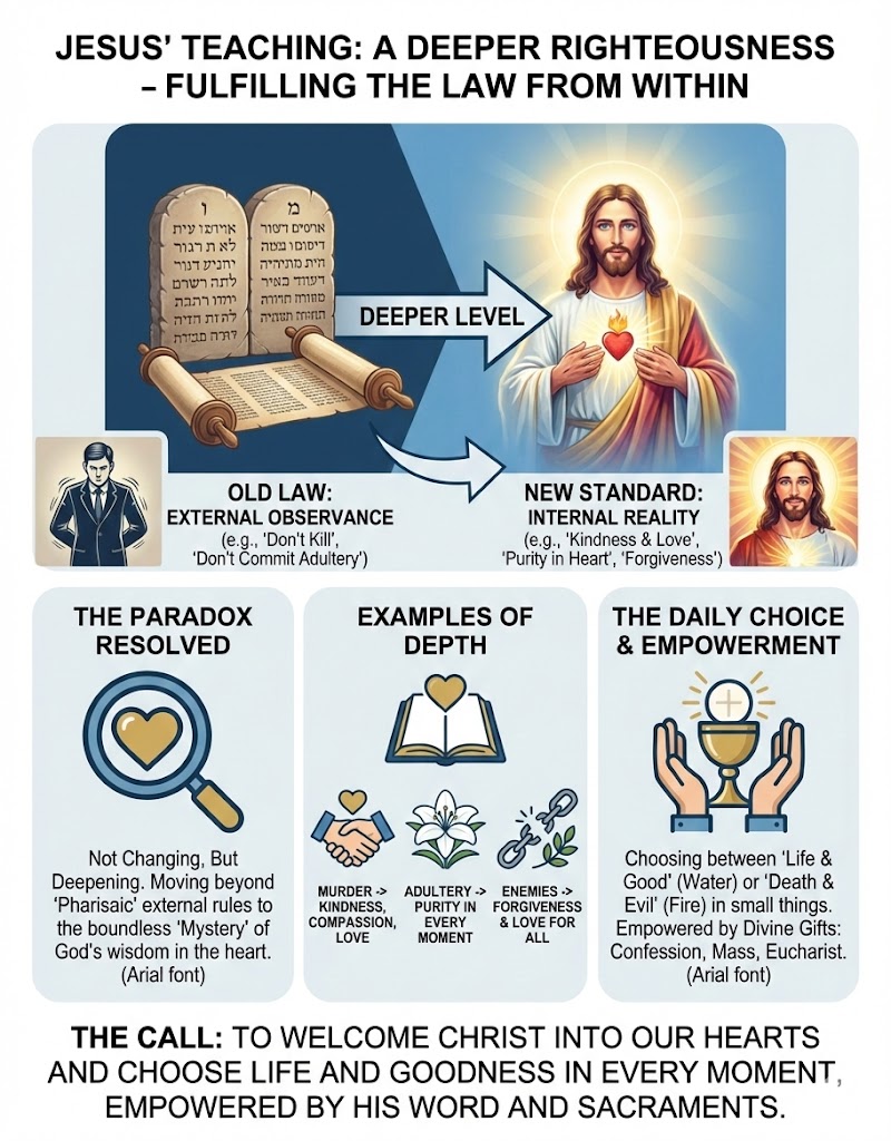 Jesus, possessing authority as the Word made flesh, calls followers to a higher standard: not just avoiding murder, but actively showing kindness; not just avoiding adultery, but maintaining internal purity. This challenge is difficult because the world dismisses the significance of small moral choices. However, Fr. Logue warns that these seemingly minor choices between “life and death” eventually harden our hearts. He concludes that we cannot achieve this deeper righteousness alone; we need the divine gifts received through confession and the Eucharist to empower us to choose goodness in every moment.