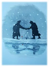 On the other side, British soldiers started singing Christmas carols, too. And both sides shouted Christmas greetings at each other. Then men started crossing the mud and barbed wire of no-man’s-land to shake hands and exchange gifts of food, tobacco and souvenirs with the enemy. In some places they buried their dead together, and elsewhere they even played soccer…