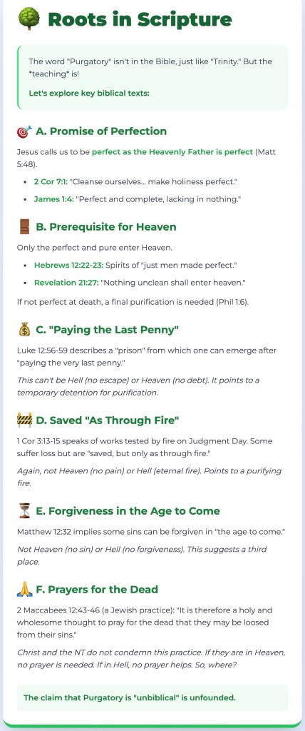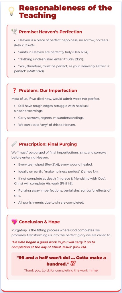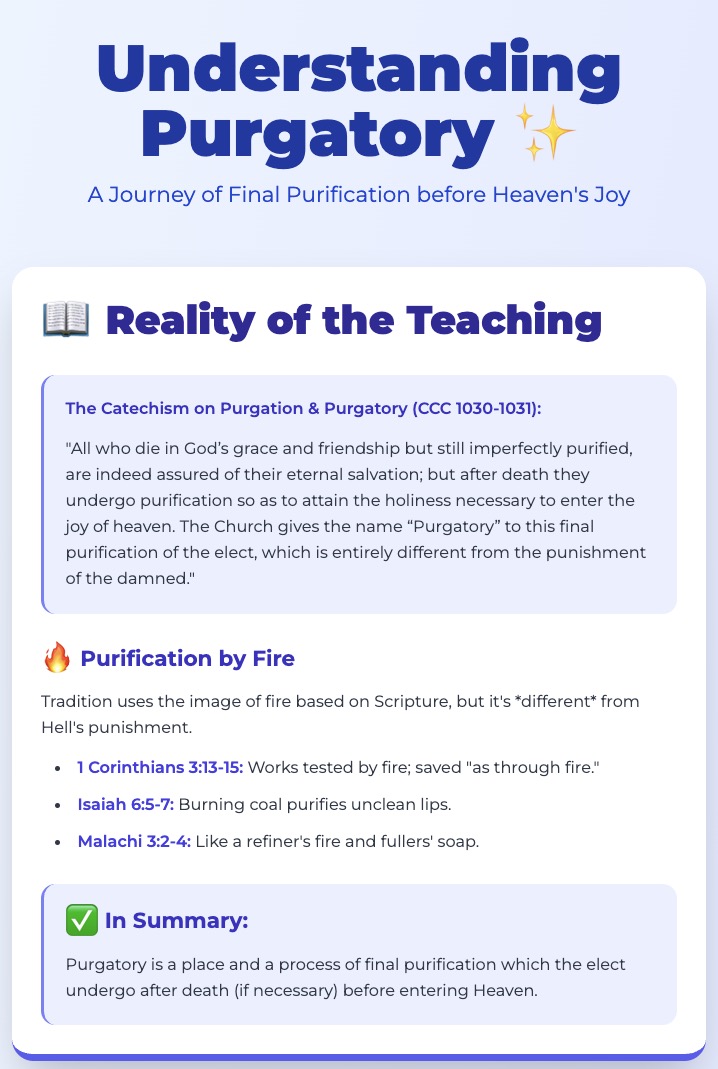 The Catholic teaching on Purgatory is one of the teachings of the Church that many struggle to understand today. Non-Catholics have generally rejected this teaching, calling it unbiblical. Actually, it is quite biblical and the biblical roots of the teaching will be shown in this reflection. Many Catholics, too, influenced and embarrassed by the protests of non-Catholics, have been led to downplay, question, or even reject this teaching. The task of this reflection is to set forth the Catholic teaching on Purgatory as both biblical and reasonable.