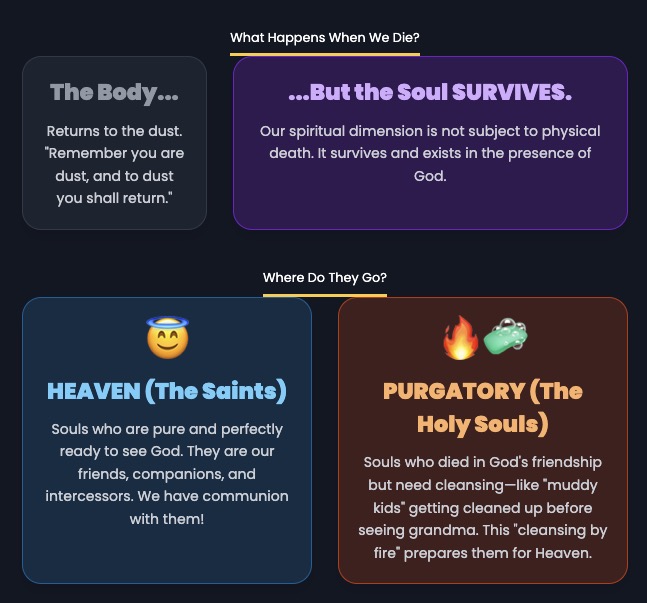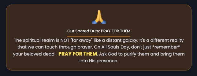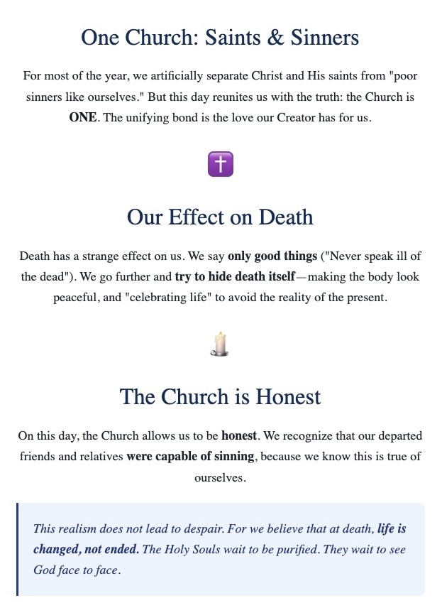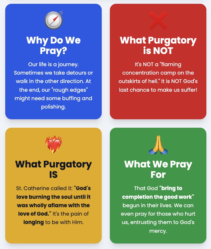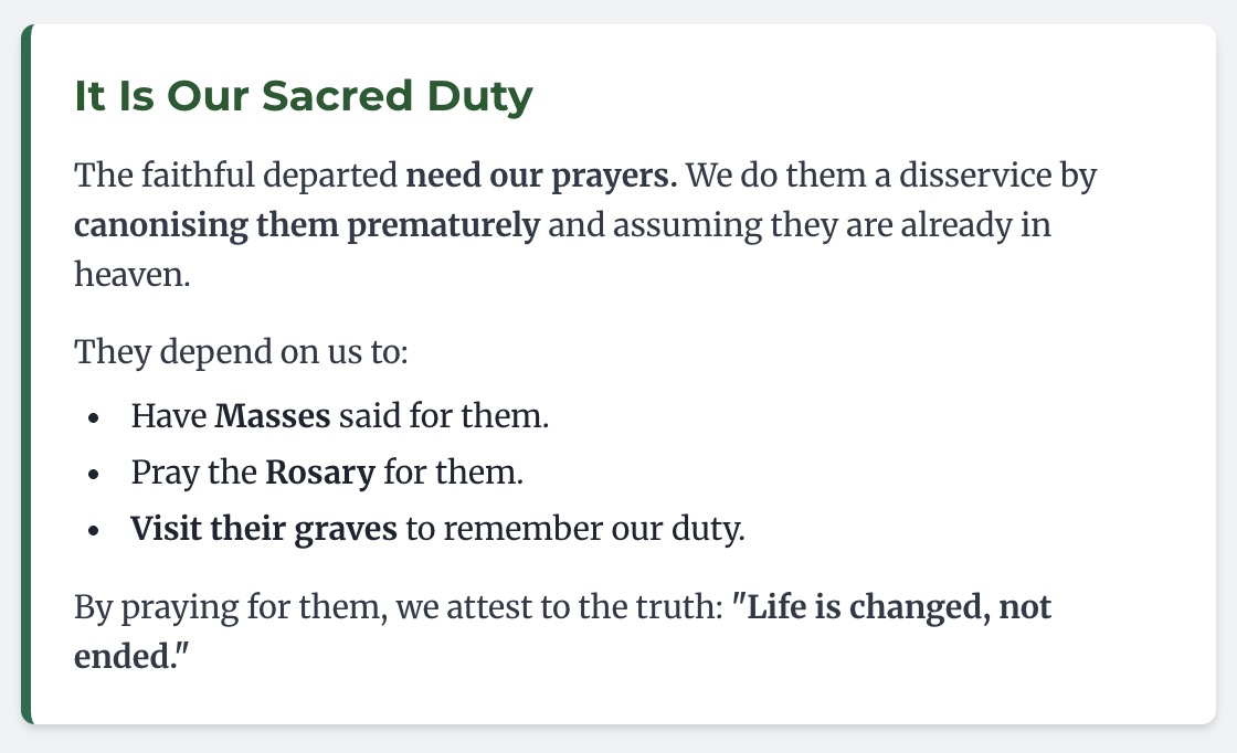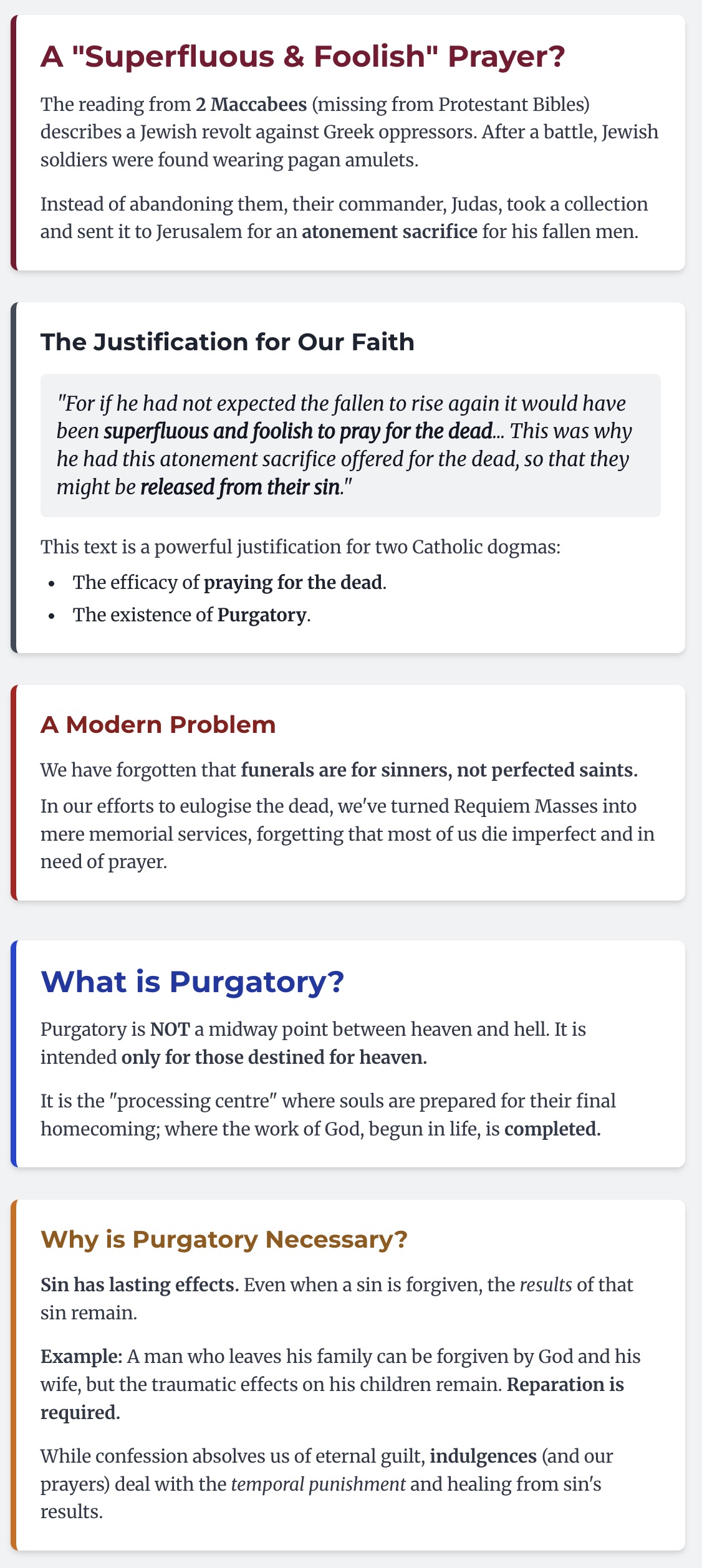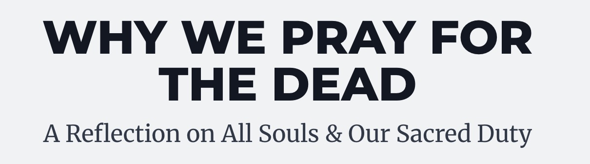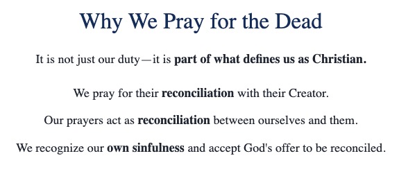 The Books of Maccabees tell us that it is a good thing to pray for the dead. But it is more than just a recommended โgood thing,โ it is our duty! Our duty is to continue to pray for the dead, for the souls in Purgatory, and we do this, because this is what the Holy Spirit has taught us to do. It is a gift of God, to allow us to share in His work in bringing His people to perfection. God wills that we should share in this work through our prayers. And by praying for them, we are attesting to the truth, โlife is changed, not endedโ at death.