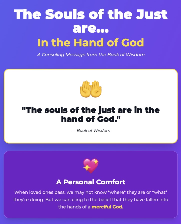The Book of Wisdom doesnโt go out of its way to describe where the souls of the dead are right now. But it does offer consoling words we are invited to place our hope in: โThe souls of the just are in the hand of God.โ Which is similar to what I held on to when my parents died. Iโve told people that I donโt know where they are, or what they are doing right now; I just believe that they have fallen into the hands of a merciful God. Family and friends pictured mom in heaven cooking up her Sunday pasta with her sisters and dad playing pinochle with his brothers-in-law. What wonderful images they are, and I am sure they offered comfort to my family at the gravesides. But all I hung on to were those merciful hands of God who created my parents, sustained them in a simple and trusting faith through hard times and final illnesses and now, is showering mercy and love on them. As Wisdom puts it, โThe souls of the just are in the hand of God.โ