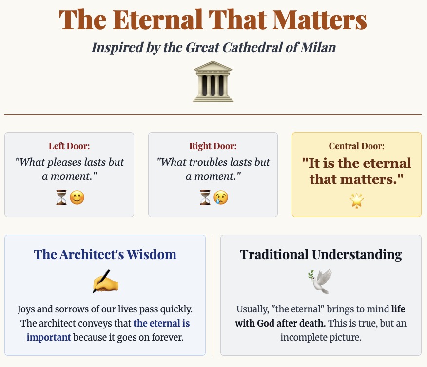 2014 HOMILY – The great cathedral in Milan, Italy, sits on a wide plaza. You can enter the church through three massive doors. Above each door there is an inscription. The inscription on the door to the left reads, โWhat pleases lasts but a moment.โ The inscription on the door to the right reads, โWhat troubles lasts but a moment.โ The inscription on the great central door reads, โIt is the eternal that matters.โ The architect of this church was trying to convey that most of the joys and sorrows of our lives pass rather quickly. It is the eternal that is important, for the eternal goes on forever.