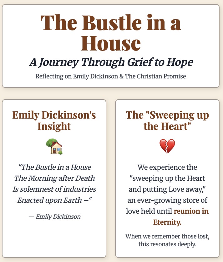 The Morning after Death / Is solemnest of industries / Enacted upon Earth โ/ The Sweeping up the Heart/ And putting Love away / We shall not want to use again / Until Eternity โ