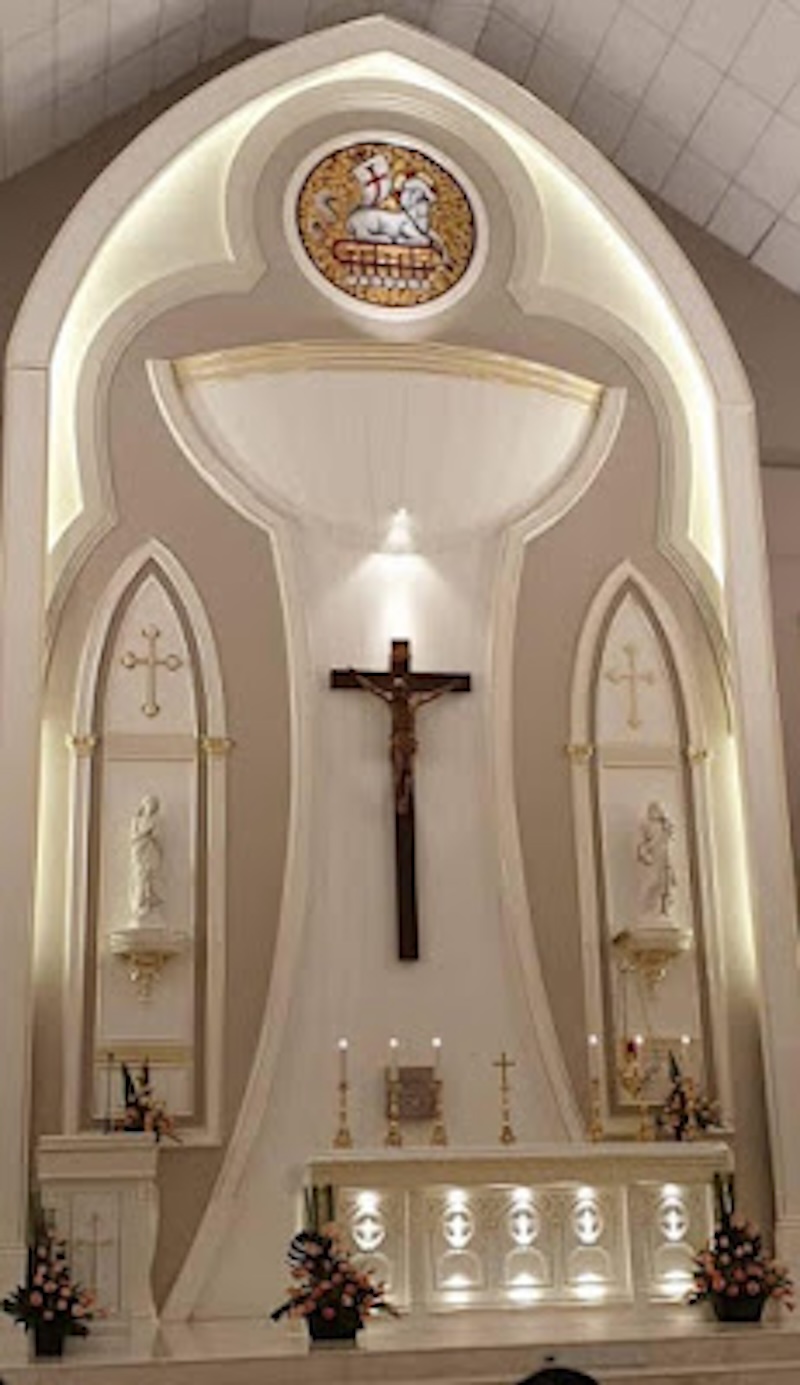 As visitors enter our Church for the first time, they would most likely be captivated or dazzled by the size and prominence given to the two geometric shapes that form the backdrop of the sanctuary – the chalice where the Precious Blood of our Lord Jesus Christ is contained, and the host-like medallion perched above it, a symbol of the Blessed Sacrament, the Precious Body of Our Lord Jesus Christ. But now with the recent renovations to our sanctuary, that very same medallion now boasts of a beautiful and colourful mosaic. Most people can discern that this is a figure of a lamb sitting on some sort of dais. Well, it isn’t a dias. It’s actually the Book (or scroll) with seven seals mentioned in Chapter 5 of the Book of the Apocalypse.