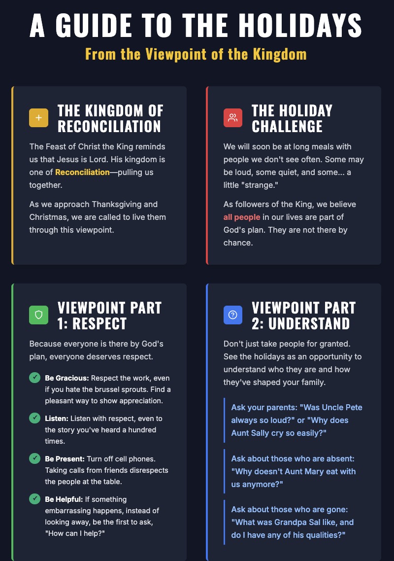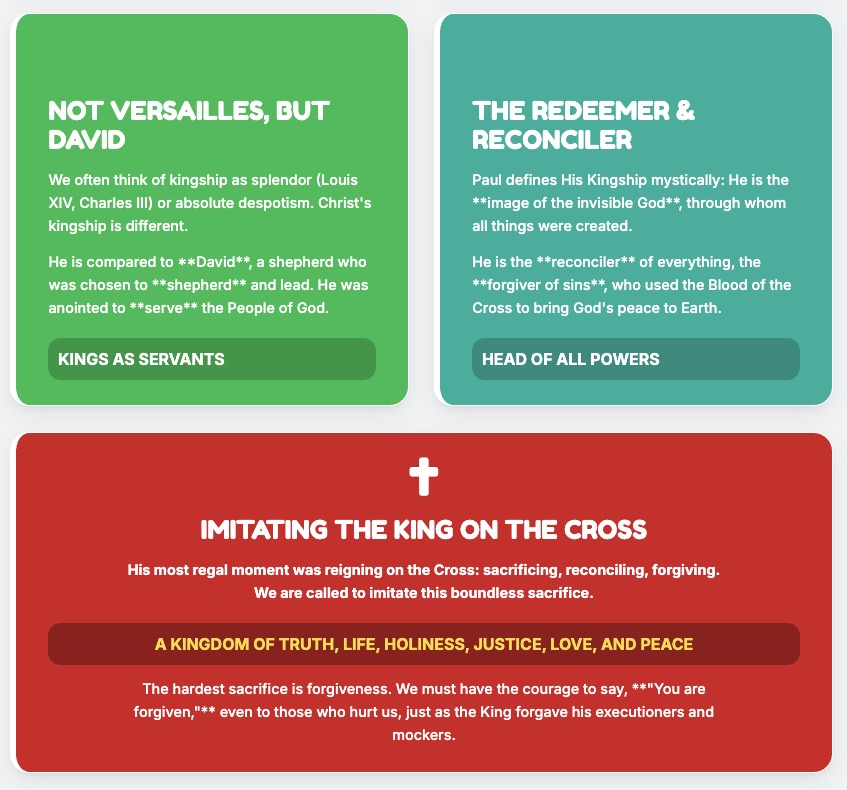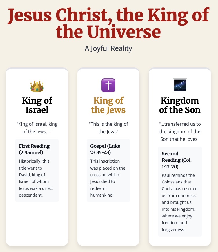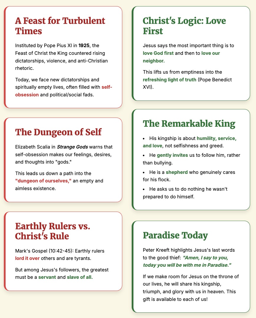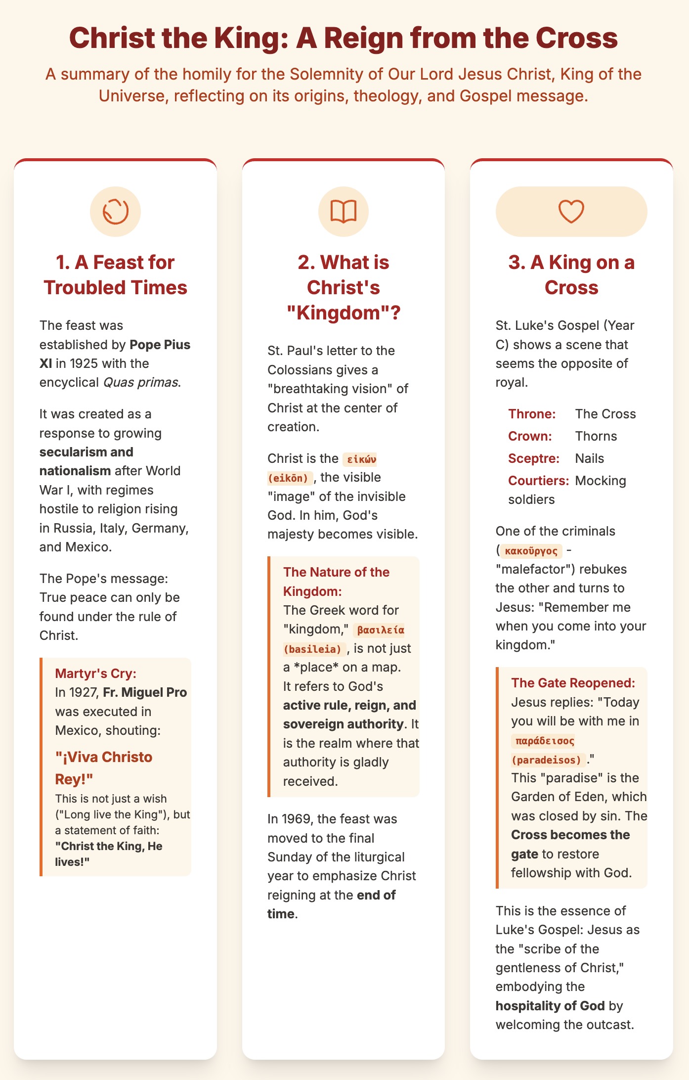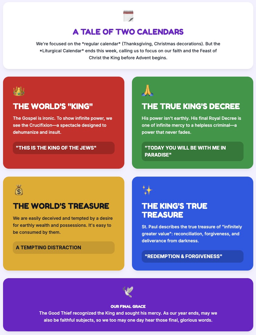 The homily contrasts the “regular calendar” (Thanksgiving, Christmas) with the “Liturgical Calendar,” which is ending with the Feast of Christ the King. It highlights the irony that Christ’s infinite power is revealed not as worldly force, but at the Crucifixion.