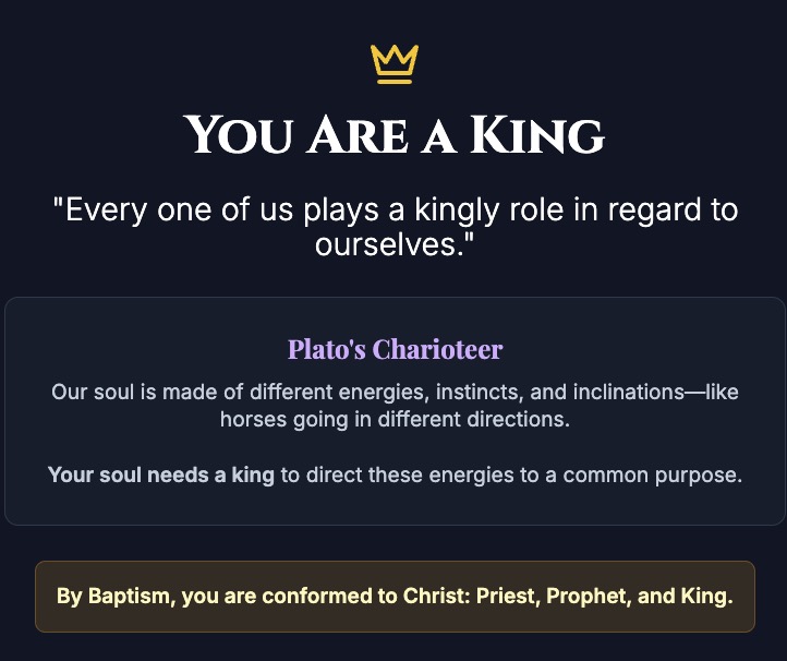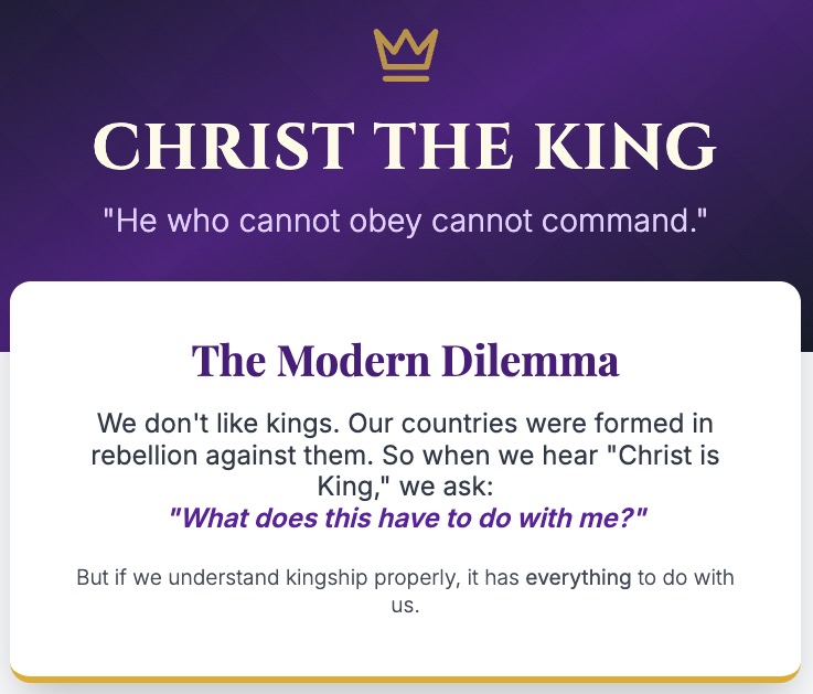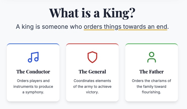Friends, we come to the final weekend of the liturgical year and the celebration of the Solemnity of Christ the King. Now, our country was formed in rebellion against a king, and kingship as a political reality is far removed from us. But what does kingship mean for us spiritually? In a word, everything. If youโre baptized, youโre a king, because youโre conformed to Christ, who is priest, prophet, and king. And your job, wherever God puts you, is to order thingsโfirst and foremost in your own soulโtoward the end of Godโs kingdom.