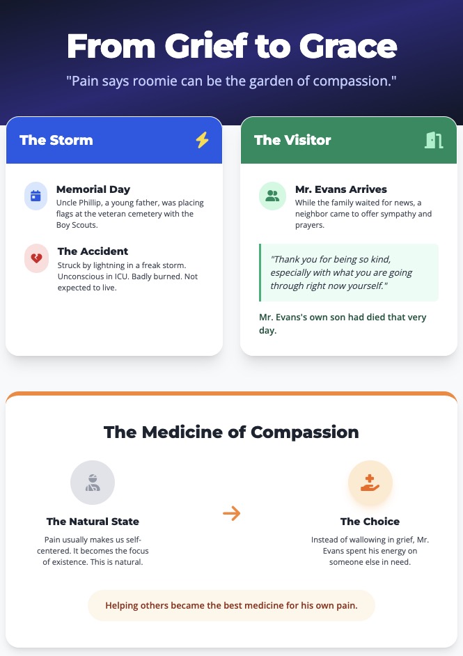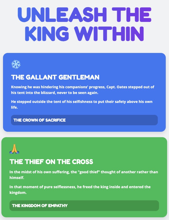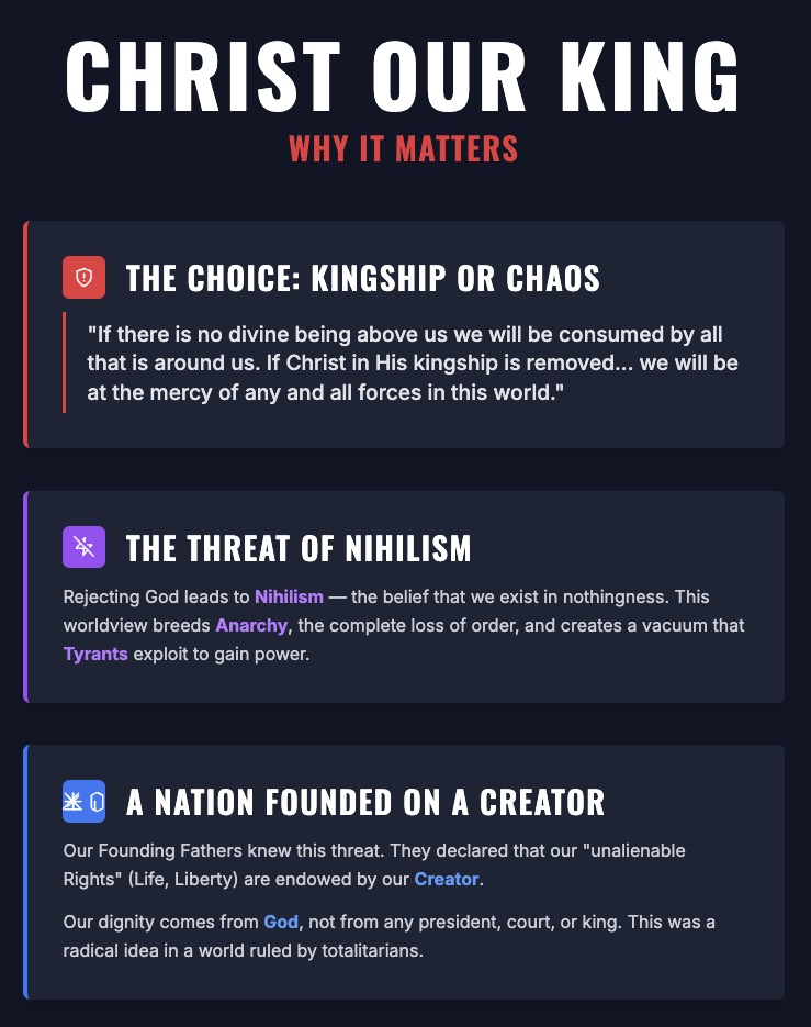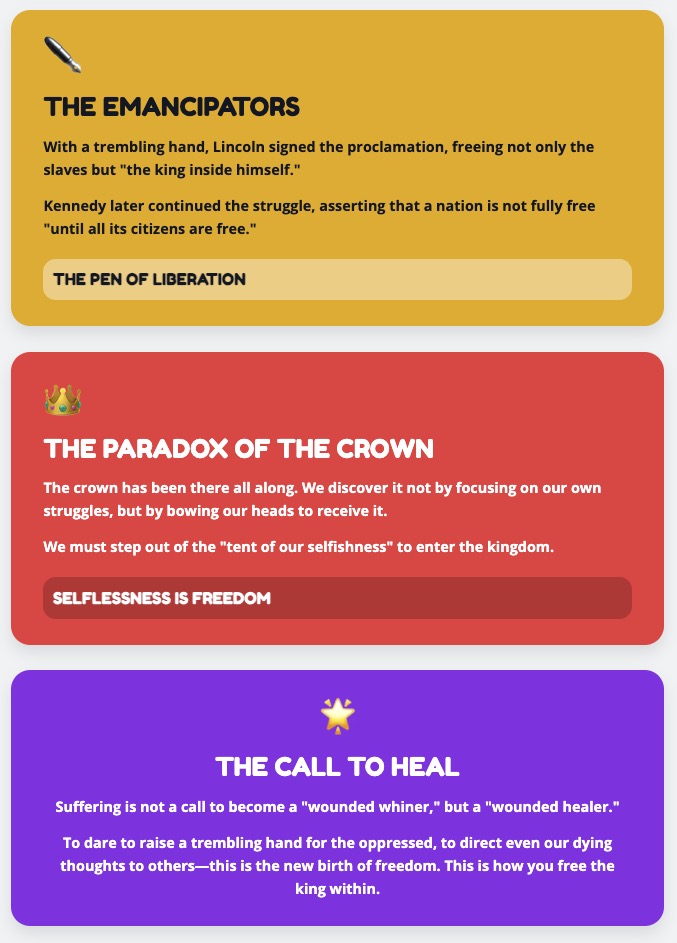Fr. Kevin’s homily explores how true freedom and “kingship” are found in selfless sacrifice for others. It highlights heroes who stepped “outside the tent of our selfishness,” like Captain Oates, who died to save his team, and the Good Thief, who showed empathy while suffering. This idea is furthered by Lincoln and Kennedy, who worked to liberate others. The homily’s core message is that suffering is a call to become a “wounded healer,” and by working to free others, we find the “new birth of freedom” and unleash the “king” within ourselves.