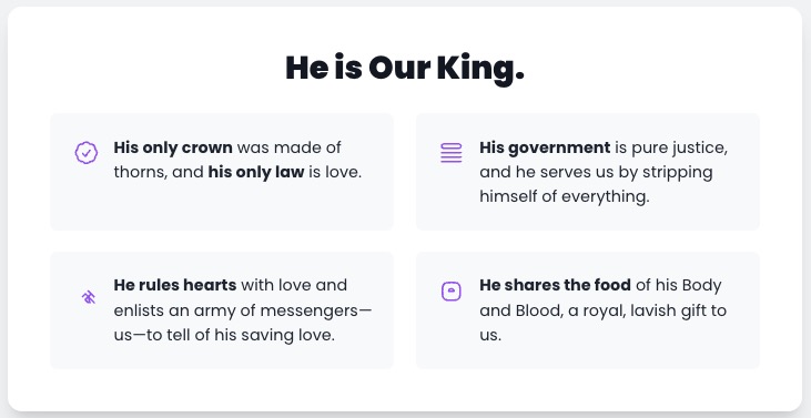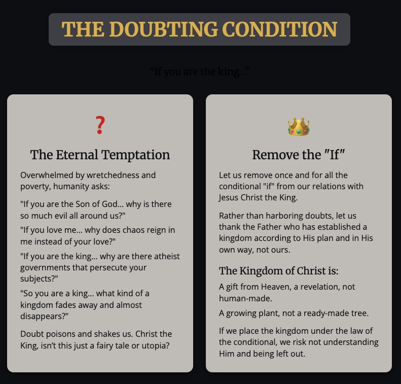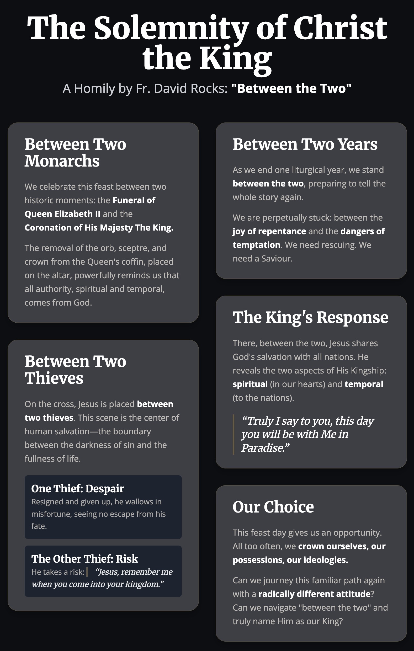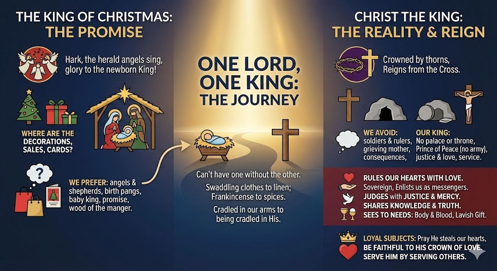 Fr. Austin notes society’s preference for the comforting “newborn King” of Christmas (angels, manger) over the harsh realities of the adult “Christ the King” (soldiers, Cross). The central argument is that these two aspects are inseparable: “we canโt have one without the other.” The child in “swaddling clothes” was being prepared for the “linen” of the tomb. Christ’s reign is paradoxical: a King with no palace, army, or throne. His crown was thorns, and his law is love. He rules by serving and dying for “the guilty.” The homily concludes that while we “cradle” the infant, the adult Christ of Calvary, who “reigns from the throne of the Cross,” now asks us to “be cradled in his arms,” ruling our hearts with the “royal, lavish gift” of his love.