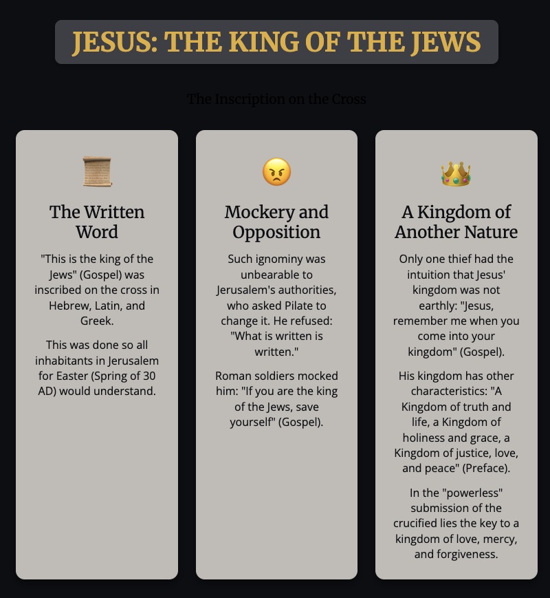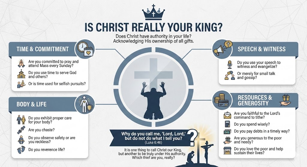 Ironically, the Gospel reveals Christ’s kingship not in glory, but on the cross. While the inscription “King of the Jews” was meant as a final, mocking insult, Christ performed his most powerful royal act: a pronouncement of infinite mercy to the good thief (“Today you will be with me in paradise”). This mercy, which reconciles the world, is his true power.