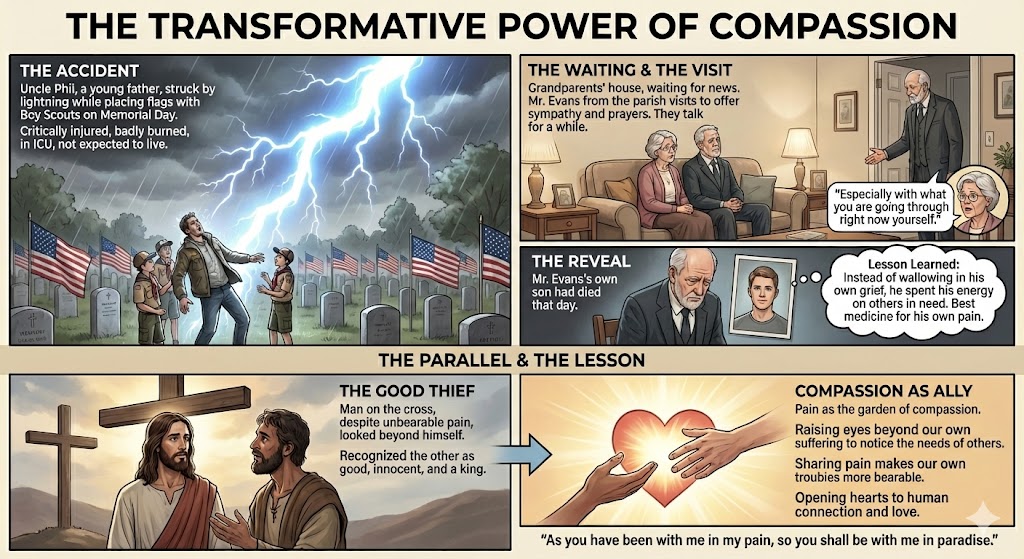 Fr. Ruttig’s homily explores how focusing on others’ suffering and showing kindness and compassion can help alleviate our own pain and transform it into something positive.