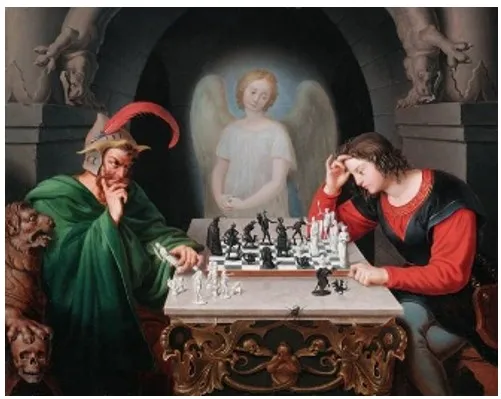 In the game of chess, the goal is to trap your opponentโs king. When he cannot move, you declare โcheckmateโ and the game is over. In 1822, the German artist Friedrich Moritz Retzsch (1779 โ 1857) captured this moment in a famous artwork he called Die Schachspieler (The Chess Players). Today, itโs more commonly called Checkmate, but this picture depicts two chess players โ a sneering devil and a worried young man, often said to be Goetheโs Faust. If the devil wins, the prize is the young manโs soul.