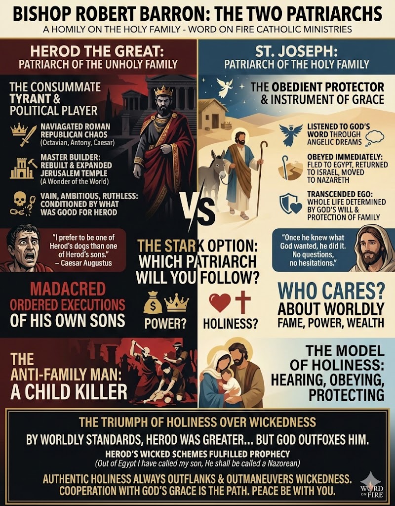 The Holy Family – Jesus, Mary, and Joseph – present an ideal for nuclear families today to emulate. Like Joseph, the father must take responsibility for the welfare of all. In the gospel Joseph listens to the Lord’s directive and acts on it. Mary may be docile, but she is also wise. She will follow her husband’s lead, but will no doubt tell him if he heads in the wrong direction. Wives and mothers are almost always the heart of the modern family. They support everyone, make needed sacrifices, and are ready to take over leadership if required.