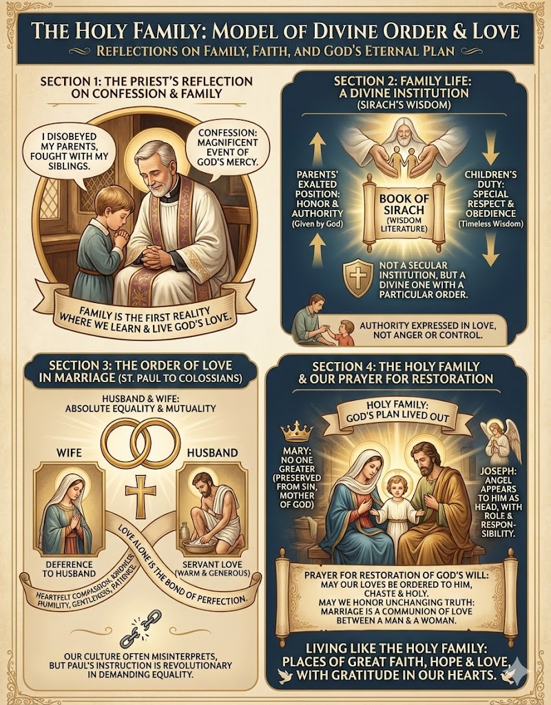 As saturated with ancient cultural norms as today’s first scripture is, Sirach offers a plan or code of family behavior good for any generation. Listen again to the virtues listed in Sirach: honor, respect, prayer, reverence, obedience, care, kindness and consideration of others – all meant to establish a loving, united household of peace. St. Paul offers a similar kind of “house order,” calling us to “put on,” like a garment, a cloak of these virtues: heartfelt compassion, kindness, humility, gentleness, patience, forgiveness of those who offend us, gratitude and a willingness to let Christ rule our hearts. To some, these words may sound pious or old fashioned. These aren’t the categories by which our culture judges success.