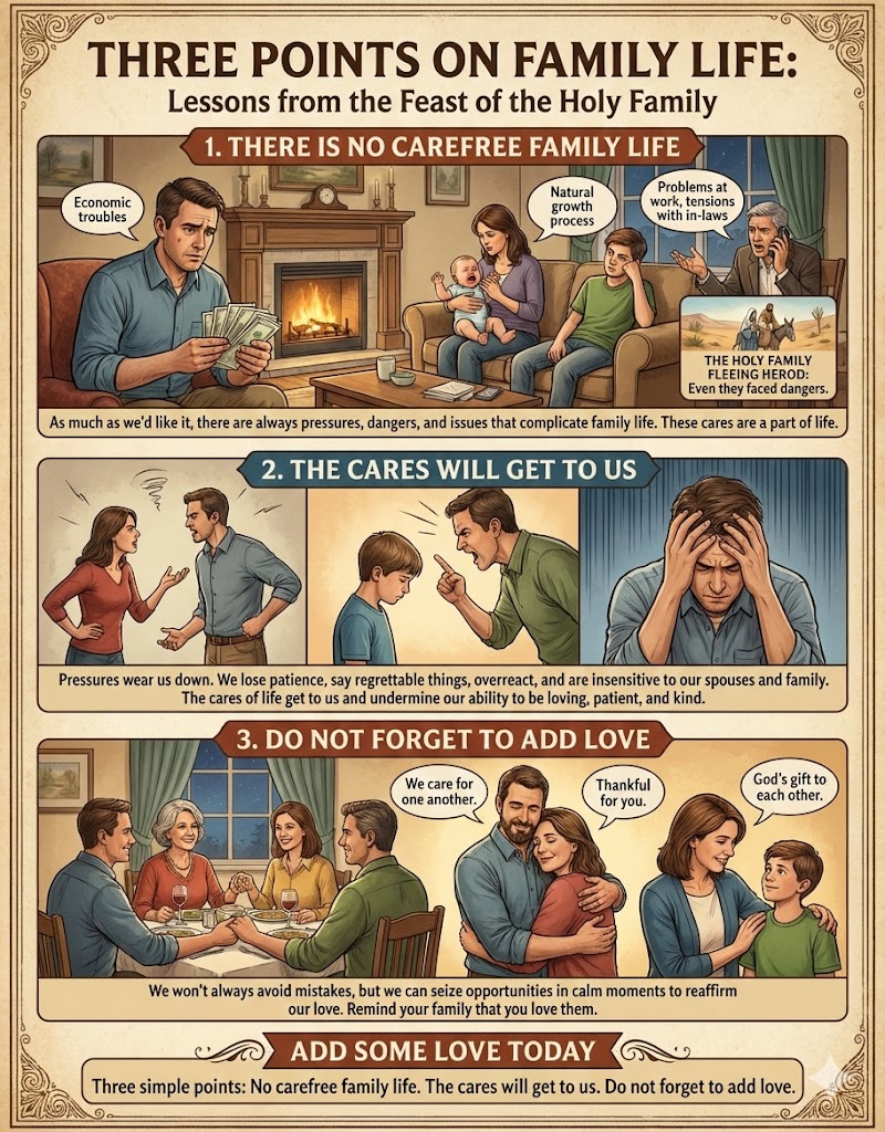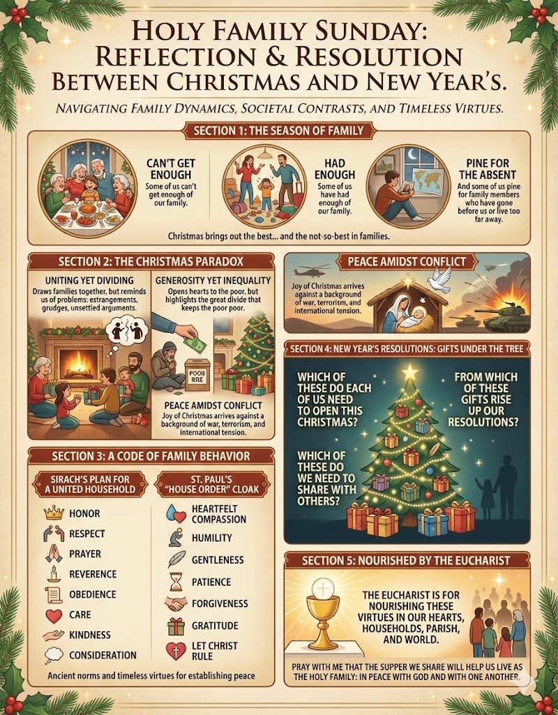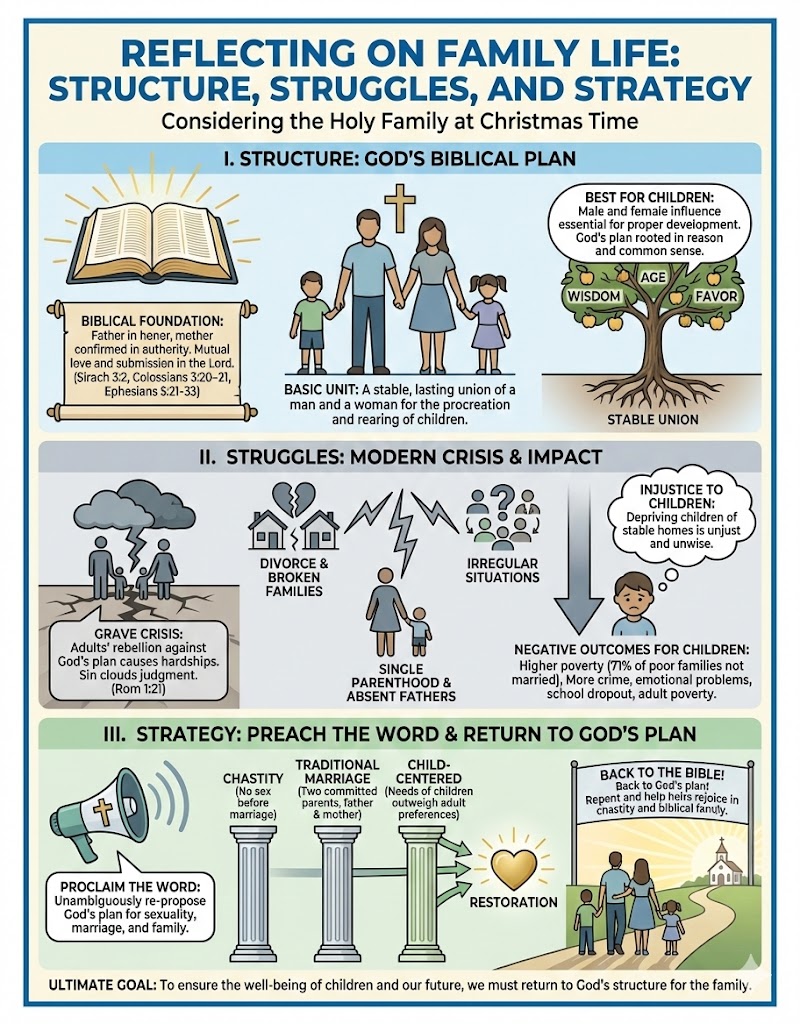 Nevertheless, here we are. Perhaps, it is a good time to reflect on family life. For, at Christmas time family, and extended family, often gather together. In terms of this feast of the Holy Family, let us make a consideration along three lines: Structure, Struggles, and Strategy.
