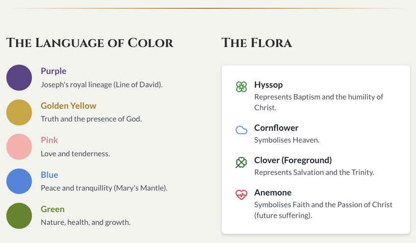 Look closely. It shows Jesus, Mary and Joseph sitting in a field. They are a close and loving family, but Mary is the central figure here because it’s through her that God worked his miracle of the virgin birth.
