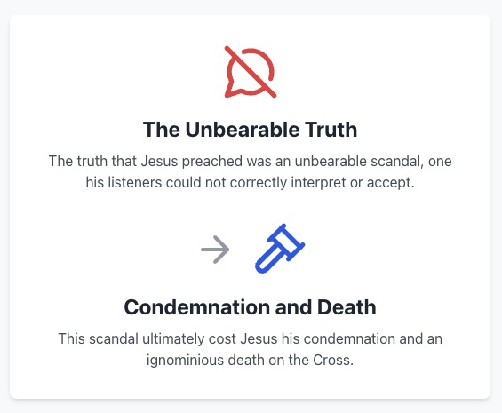 Final prompt for reflection: The text concludes that the truth Jesus preached was an “unbearable scandal” that led to his condemnation and death. What does this suggest about the nature of truth itself? Is genuine, transformative truth always met with resistance and difficulty? What is the enduring message of “The Scandal of Jesus Christ”?f suffering into a source of merit and glory for God.