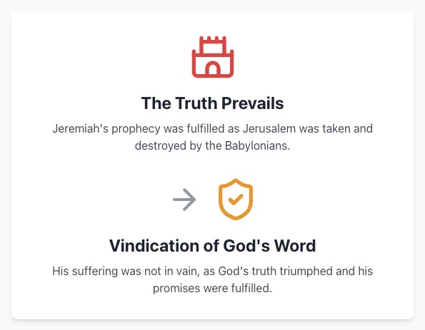 - The text concludes that “God’s truth which he has conveyed will prevail and triumph.” In what way did Jeremiah’s truth triumph, and what was the ultimate outcome for Jerusalem and its people?
