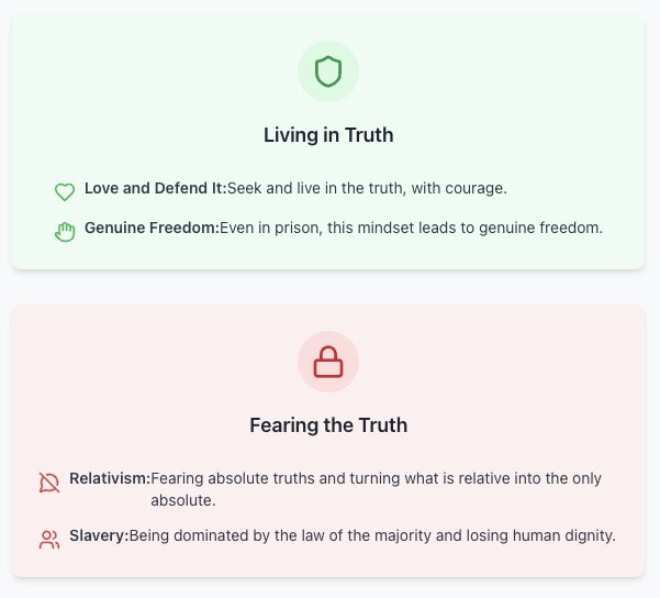The conclusion that “to be afraid of the truth is to be afraid to be one’s self” and that this results in “losing human dignity” is a powerful summary of the Catechism’s teaching on the nature of the person. We are created in the image of God, and to deny the truths of our nature is to deny God and, ultimately, ourselves. True freedom is not the freedom from truth, but the freedom to live the truth.