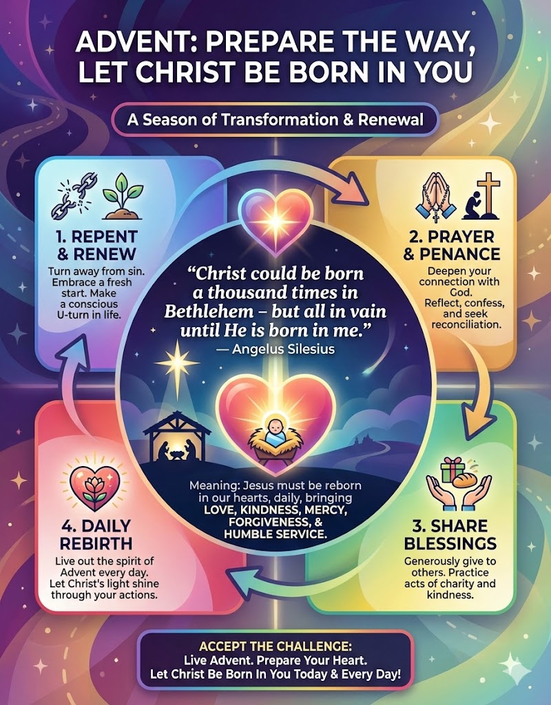 Advent is the time for us to make this preparation by repenting of our sins, and renewing our lives through prayer, penance, and sharing our blessings with others. Let us accept the challenge of the German mystic Angelus Silesius “Christ could be born a thousand times in Bethlehem – but all in vain until He is born in me.” He means that Jesus must be reborn in our heart, during this season of Advent and every day of our lives, bringing us love, kindness, mercy, forgiveness and the spirit of humble service.