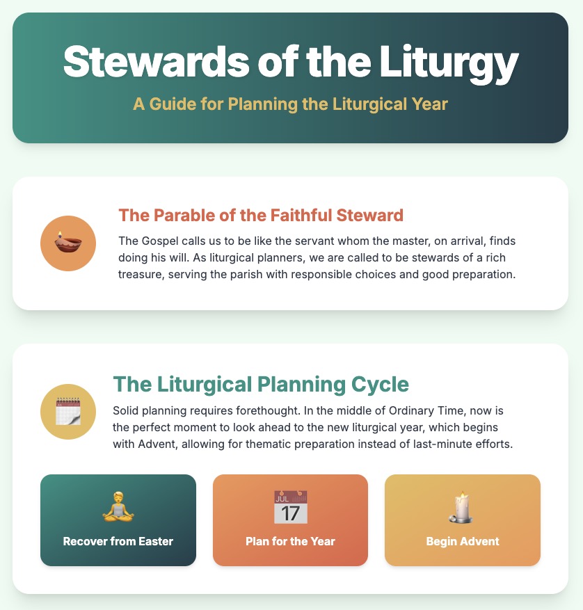 EXCERPT: We are nearing the middle of that long period of Ordinary Time, so planners ought to have recovered from Lent and Easter by now. As the school year gears up and many activities resume in the parish, this could be a good time to do some advance planning for the coming liturgical year, which begins with Advent. Could planners set aside a day, or at least part of a day, to look ahead to the whole year and begin thinking about tasks that might take extra time before a feast or season?