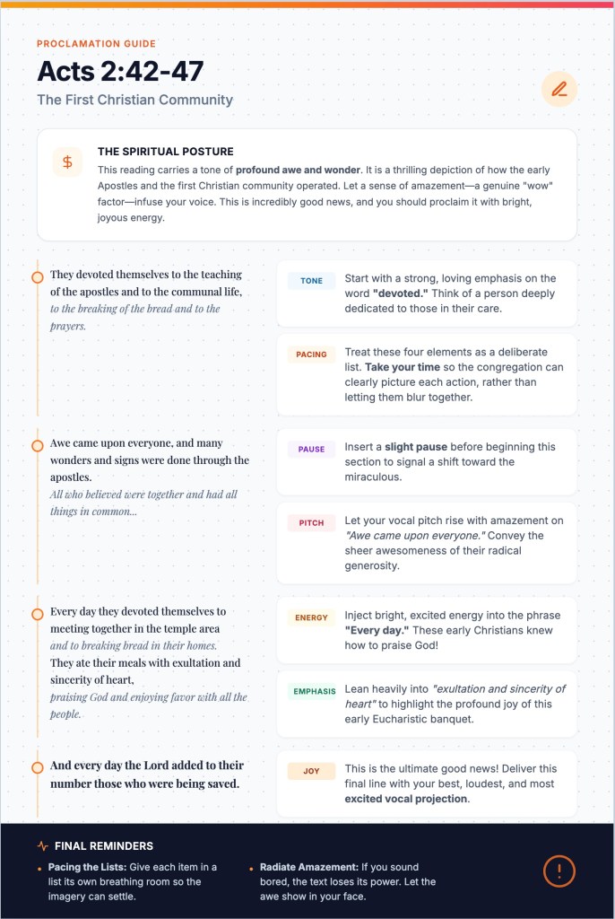 you are a lector coach and your task is to instruct lectors. Create an 8.5x11 infographic showing how to best proclaim the following reading. Offer tips on pacing, pronunciation, clarity, etc. . Proclaim the text with authority and purpose, not just reading it, and maintain a prayerful, confident demeanor. Key techniques include using pauses, making eye contact, and dressing appropriately. The bible translation is provided below.