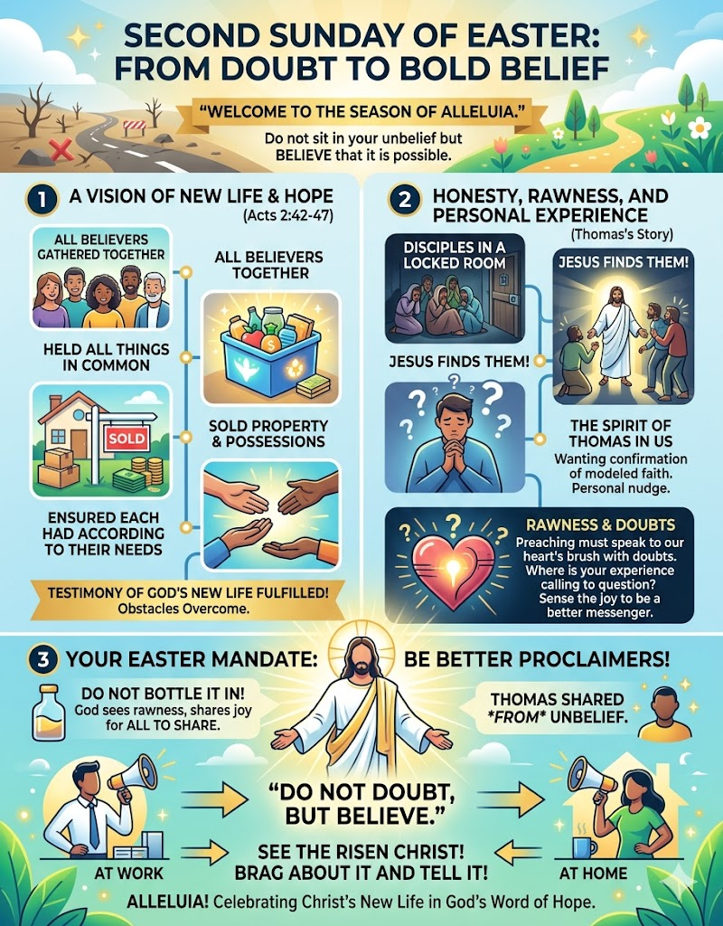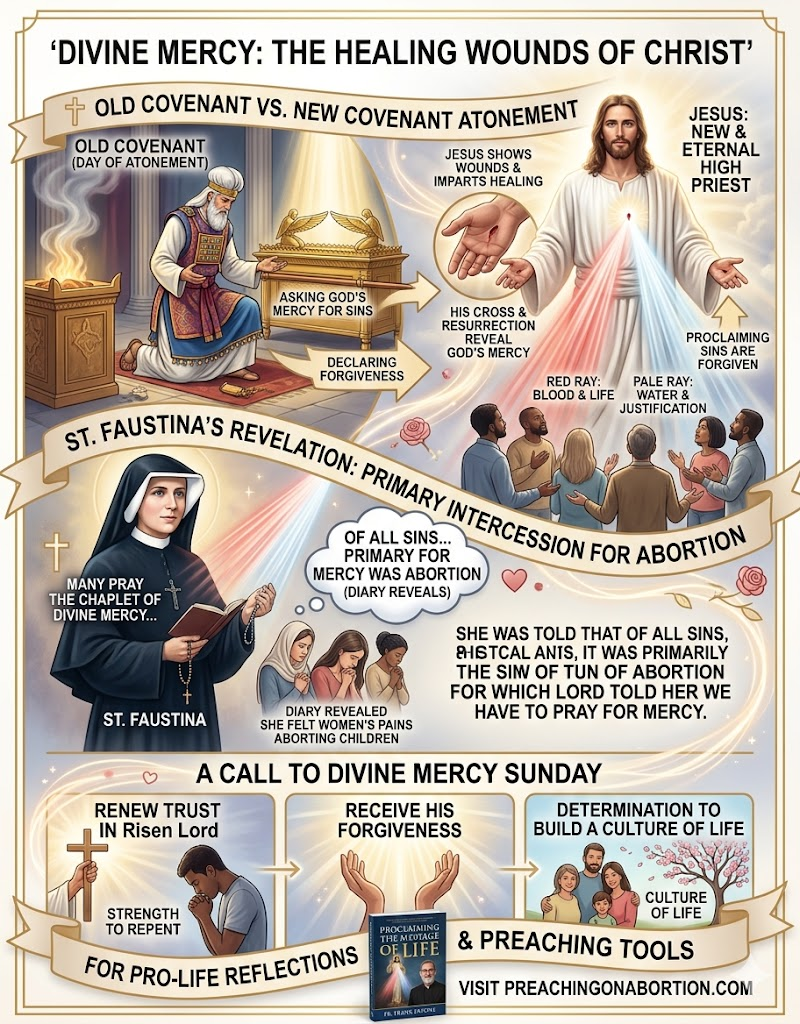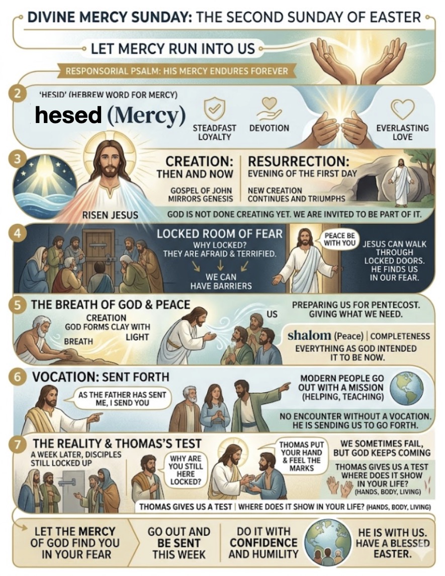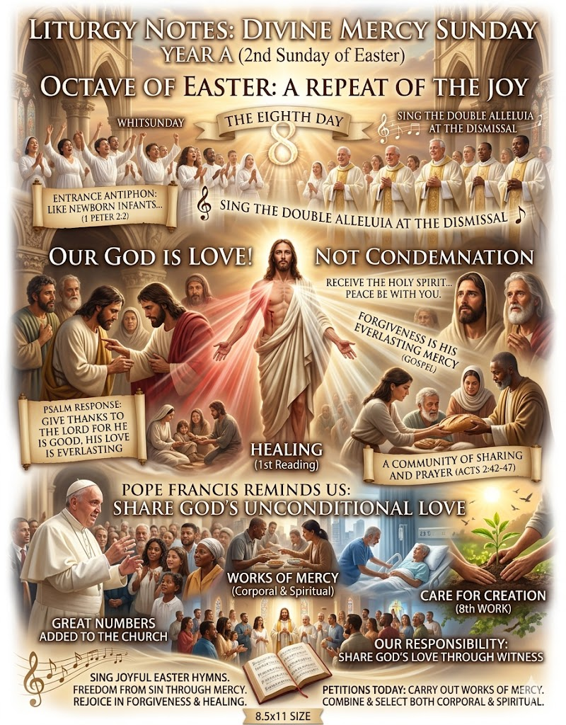 create an 8.5x11 infographic for Divine Mercy Sunday (A) wtih sweeping large photo realistic images . Do not present in a stacked layout, but rather offer a continues flowing unified whole theme showing connections and relationships takeaways from Fr. lawrence Mick's Liturgy Planning Notes.