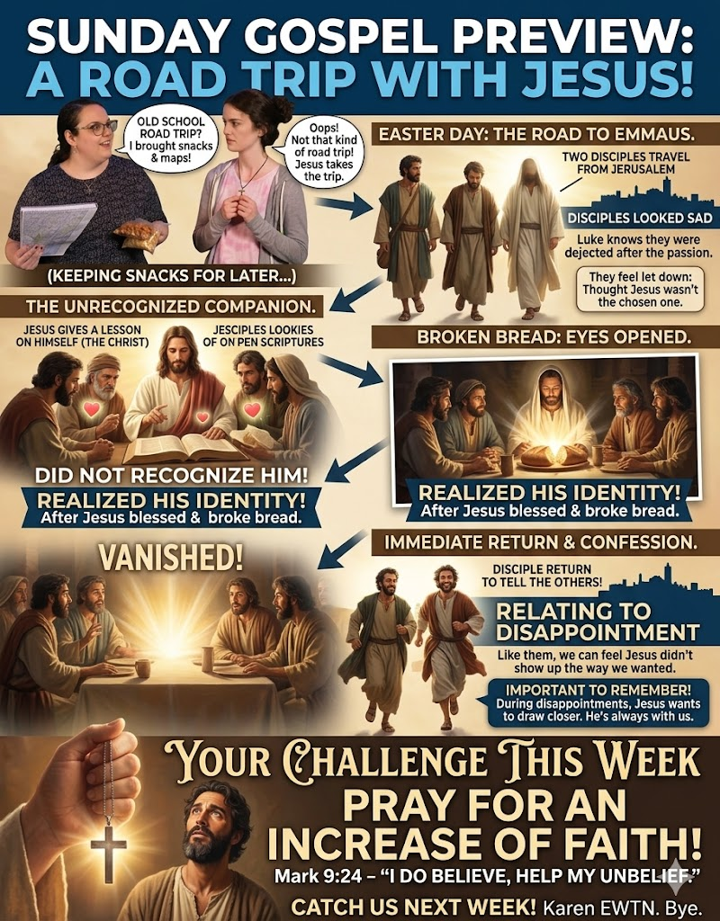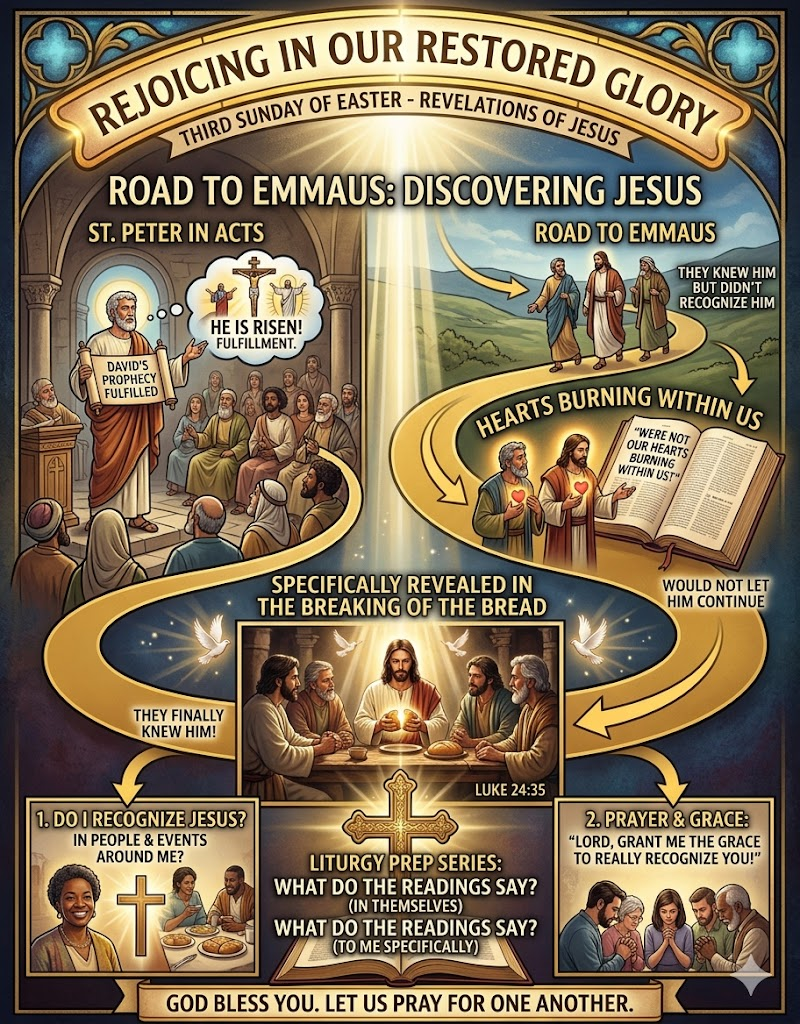 - For ourselves and our personal "Emmaus Walks": When we are confused, dejected, or when things "don't pan out" the way we planned—like a job loss, a setback in recovery, or a struggle with health—that we may perceive the presence of Jesus walking beside us, ready to provide strength. Risen Lord, burn within our hearts.