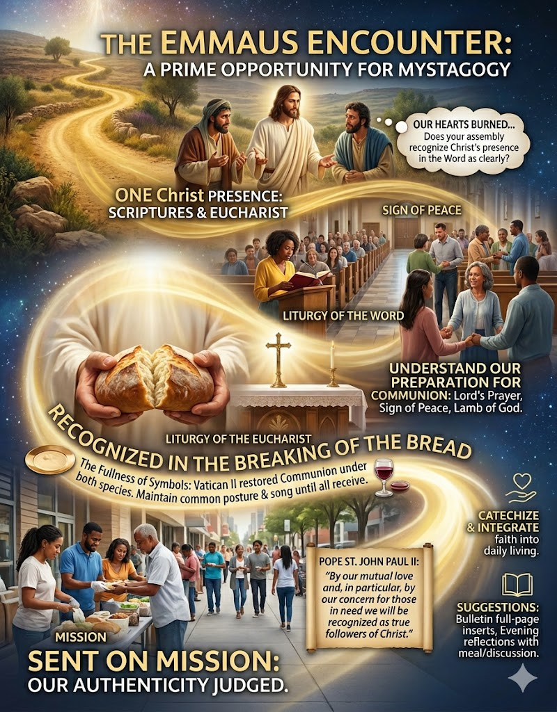 Today’s Gospel of the encounter on the way to Emmaus offers a prime opportunity for some mystagogical preaching on the Eucharist. This rich passage illuminates a number of aspects of the Eucharist that might be the basis of preaching and reflection.