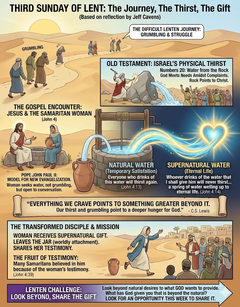 - For all of us gathered here during this holy season: that we may recognize that every earthly craving points to a greater need for God, and that we may never settle for temporary satisfaction when Christ offers us the supernatural gift of Himself. We pray to the Lord. (Response: Lord, quench our thirst with your living water.)