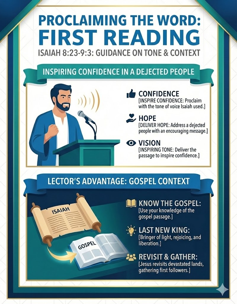 Proclaiming It: Of course the lector will want to proclaim this passage with the same tone of voice Isaiah used in delivering it, trying to inspire confidence in a dejected people. The lector has the advantage of knowing the gospel, and of having read today's gospel passage in particular. So you know that the last new king, bringer of light, rejoicing and liberation, has begun by revisiting the once devastated lands and gathering his first followers.