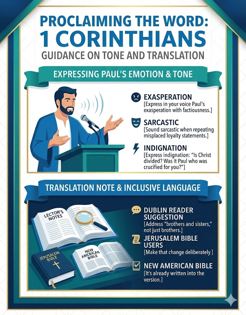 Proclaiming It: Express in your voice Paul's exasperation with the factiousness of the Corinthians. Sound sarcastic when you repeat Paul's rendition of the Corinthians' statements of misplaced loyalty ("I belong to ..."). Use your voice to express Paul's indignation when he asks "Is Christ divided? Was it Paul who was crucified for you? In whose name were you baptized, after all?"