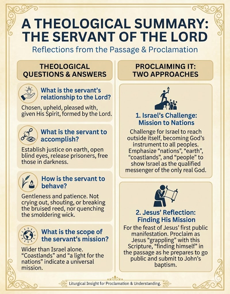 Proclaiming It Another Way: Secondly, since this is the feast of the first public manifestation of the mission of the adult Jesus, the lector might try to "get into Jesus' head" as he grappled with this passage in his own heart. Don't assume that Jesus knew the future in detail, and always had a clear career-path in mind. After all, he indisputably submitted to John's baptism. Ask how Jesus "found himself" in this Scripture passage. You might proclaim it as if you were Jesus reading it aloud to himself and mulling it over as he prepares to go public.