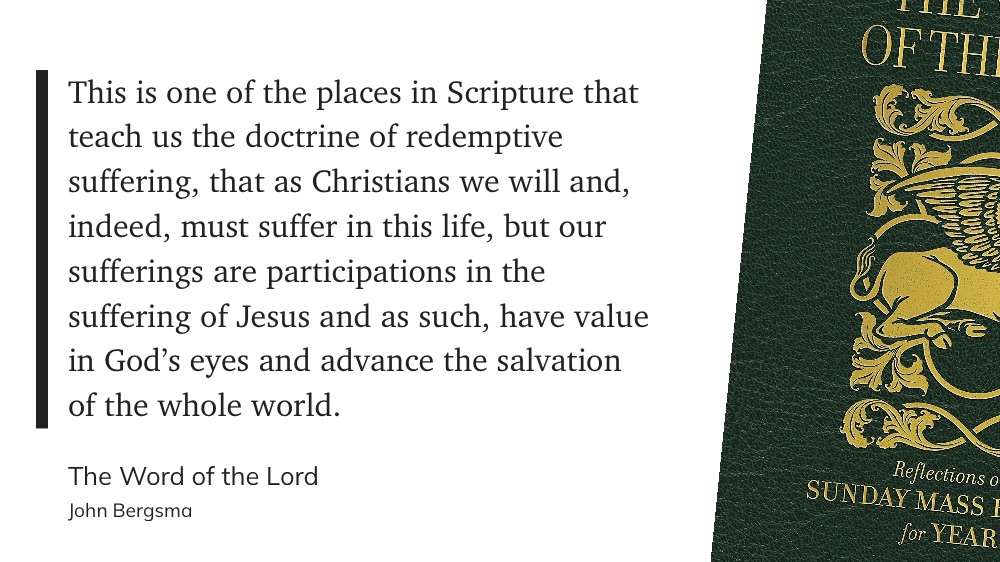 Colossians 1:24-28 speaks of St. Paul’s understanding of his own role in Christ’s mission and emphasizes the importance of making Christ present in our lives. St. Paul asserts that he “makes up in his own sufferings what is lacking in the sufferings of Christ for the sake of the Church” (Colossians 1:24), an idea rooted in Catholic theology.