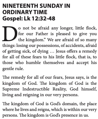 Fr. Paul notes that this passage, written at a time when Christians were expecting Christ’s imminent return, addresses the idea of a delay. The commentary highlights several key themes: Jesus’ loving concern for his “little flock,” the importance of focusing on “an inexhaustible treasure in heaven” rather than earthly wealth, and the model of Jesus as a servant leader.