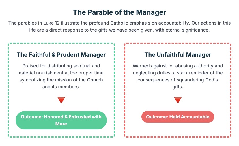 The parables of the watchful servants and the faithful and unfaithful managers (Luke 12:36-48) further illustrate the Catholic emphasis on accountability. The “faithful and prudent manager” (Luke 12:42) is praised for distributing food at the proper time, symbolizing the Church’s mission to dispense spiritual nourishment and material aid. The warning against the unfaithful servant, who abuses his authority and neglects his duties, serves as a stark reminder of the consequences of neglecting one’s responsibilities, especially for those entrusted with leadership. This aligns with Catholic teaching on the particular judgment, where each soul will account for their life’s actions.