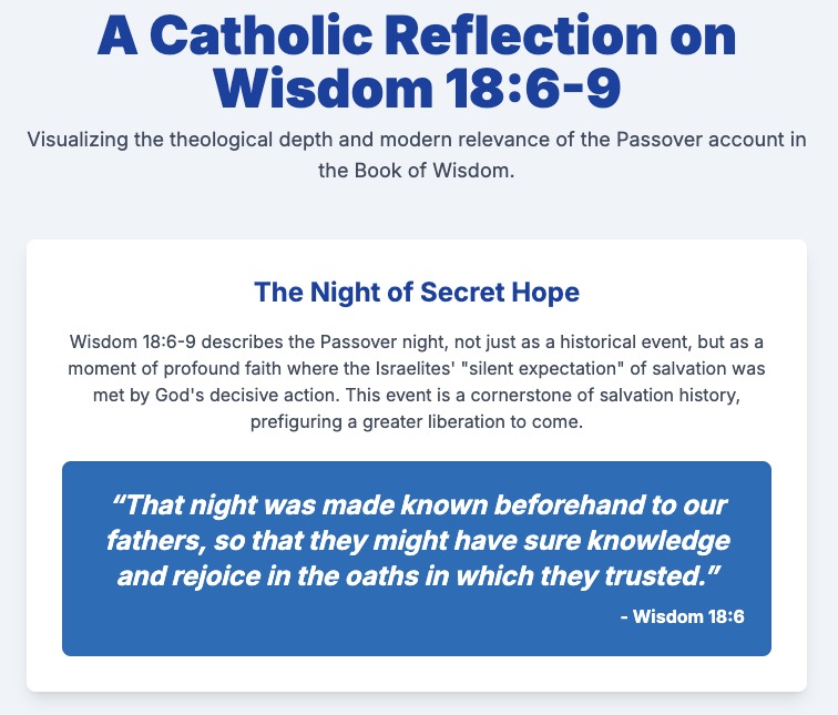Wisdom 18:6-9 vividly recounts the night of the Passover, where God’s “holy people awaited the salvation” (Wisdom 18:7) while their enemies faced destruction. In Roman Catholic theology, this passage is deeply significant as a profound prefigurement of Christ’s Paschal Mystery.