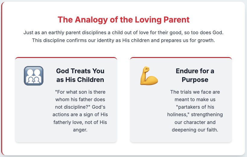 Discipline and “Tough Love”: Broding suggests that the author of Hebrews uses this “tough love” parenting analogy to explain the struggles Christians endure. The struggles are not necessarily intense persecution but are the difficulties of daily life that lead to spiritual growth.
