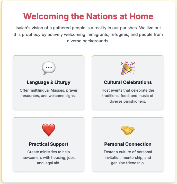 - We live out this prophecy by welcoming immigrants and refugees. What are some practical ways a parish community can be more welcoming to people from diverse backgrounds?