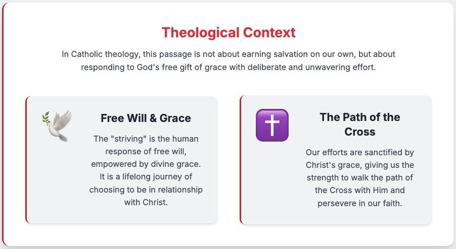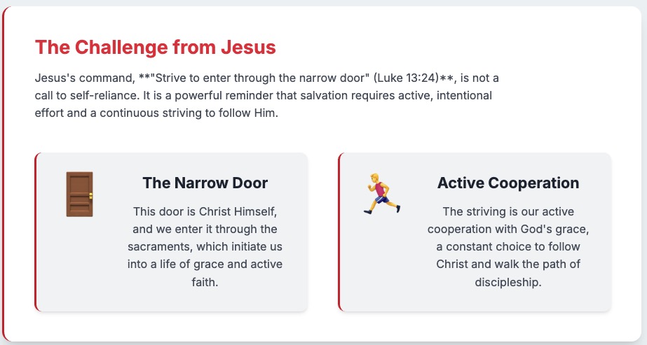 In Catholic theology, this passage is understood through the lens of both grace and free will. The “striving” Jesus speaks of is not a form of Pelagianism, which would suggest we can earn salvation through our own efforts alone. Rather, it is an active cooperation with Godβs grace, which is freely given to all. The “narrow door” is Christ himself, and we enter it through the sacraments, particularly Baptism, which initiates us into a life of grace. This life, however, requires a constant choice to follow Christ, to “make every effort” (Hebrews 4:11) to be in relationship with Him. The passage is a reminder that while God’s mercy is infinite, our response must be deliberate and unwavering. It is the journey of the faithful, who, in their freedom, choose to walk the path of the Cross with Christ.